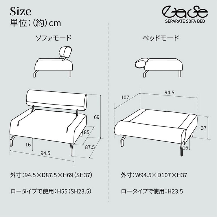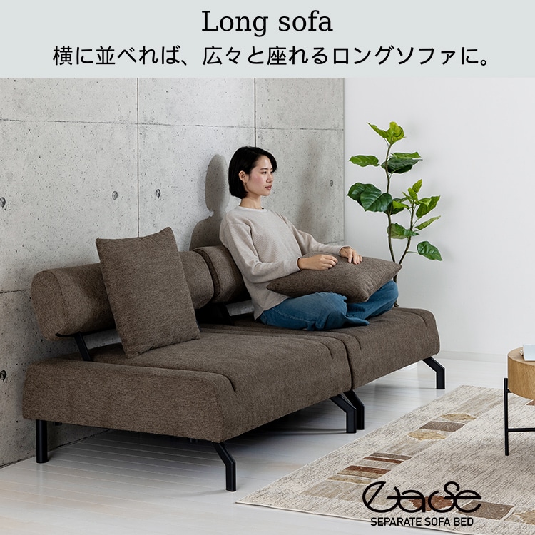 背もたれを倒すだけでベッドに早変わりするソファベッドです。座面には高密度ウレタンを使用しているため、座り心地もよくゆったり座れる仕様です。別途、ローソファとしてもお使いいただける短脚と、クッション2個も付属しています。