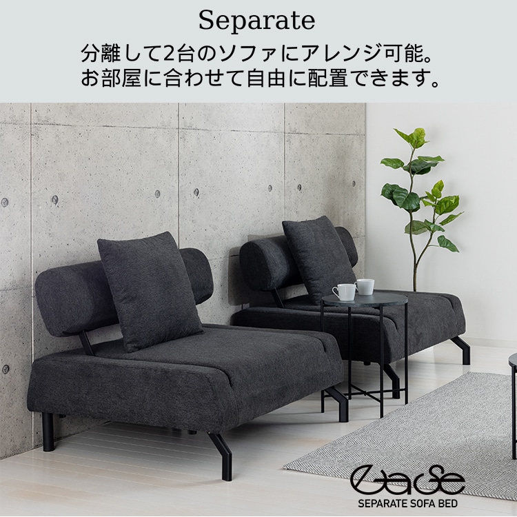 背もたれを倒すだけでベッドに早変わりするソファベッドです。座面には高密度ウレタンを使用しているため、座り心地もよくゆったり座れる仕様です。別途、ローソファとしてもお使いいただける短脚と、クッション2個も付属しています。