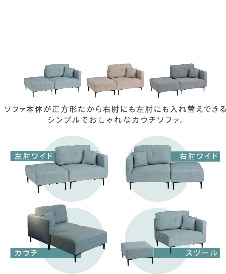 コンパクトサイズのカウチソファで、左右入れ替え可能な肘により、さまざまなレイアウトに対応できます。