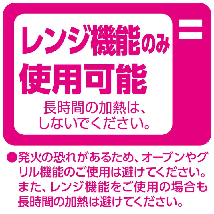 発火の恐れがあるため、オーブンやグリル機能のご使用は避けてください。また、レンジ機能をご使用の場合も長時間の加熱は避けてください。