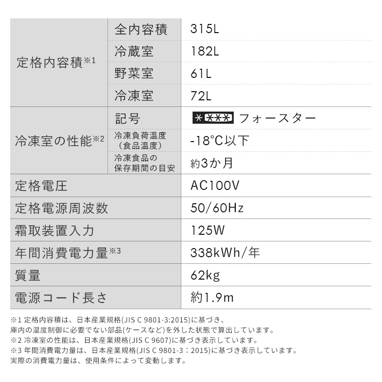 ※1 定格内容積は、日本産業規格(JIS C 9801-3:2015)に基づき、庫内の温度制御に必要でない部品(ケースなど)を外した状態で算出しています。