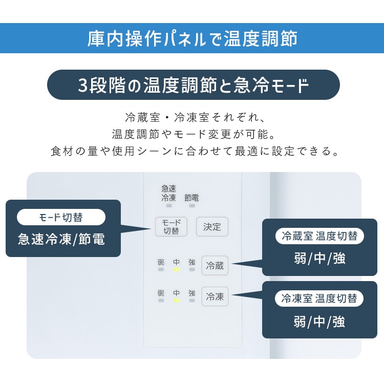 操作パネルで、庫内の温度を各3段階(弱・中・強)と3モード(急速冷凍・節電・通常)の切り替えができます。