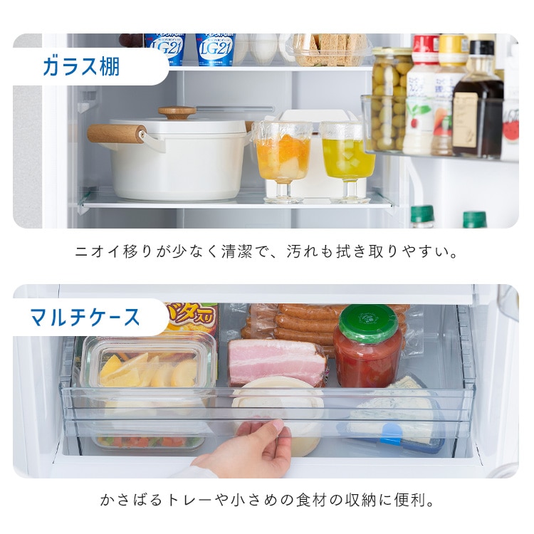 食品サイズに合わせて収納できる3段ドアポケットや、高さを調整できるガラス棚など、収納力に優れた庫内設計です。