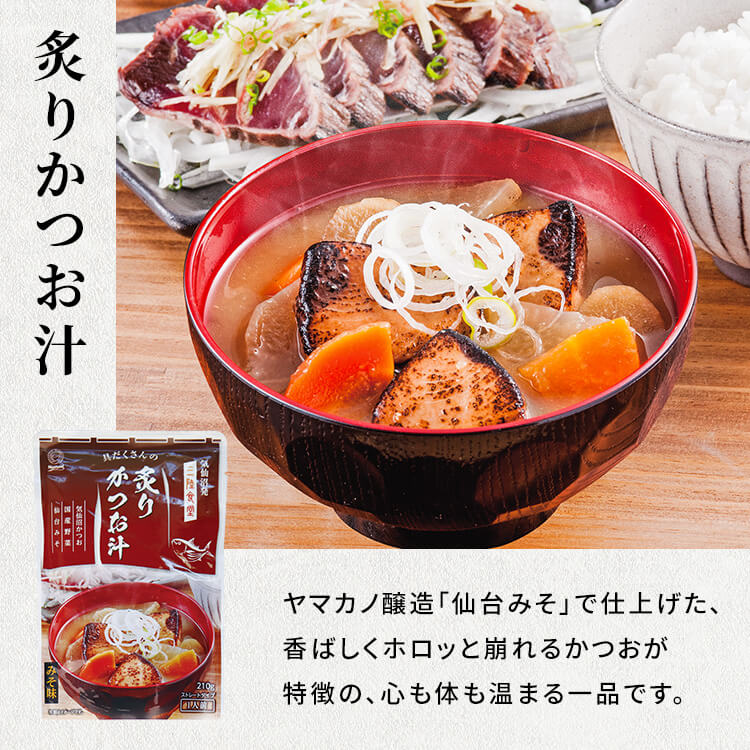 【三陸食堂炙りかつお汁】野菜(大根、ニンジン、ごぼう)、かつお(宮城県産)、味噌、酒、みりん、鰹節エキス、風味調味料、昆布エキス/トレハロース、増粘剤(加工でん粉)、調味料(アミノ酸等)、(一部にさば・大豆を含む)