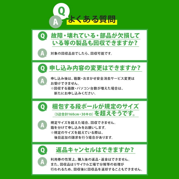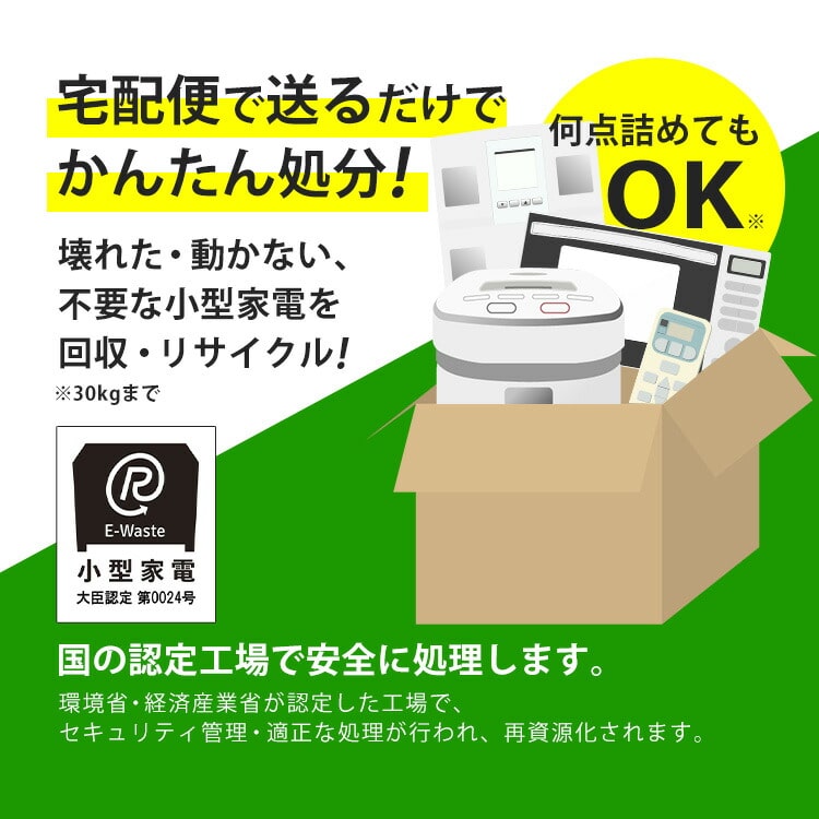 ・本製品には段ボール1箱分の宅配便回収料金・リサイクル費用が含まれます。(段ボールサイズは縦横高さの3辺が160cm・重量30kg以内。1箱に何点でも同梱いただけます。)