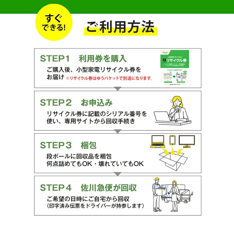 ・利用方法 1.購入後リサイクル券をお届け、2.リサイクル券記載の方法で回収申込、3.廃家電を段ボールに梱包、4.指定日時に回収