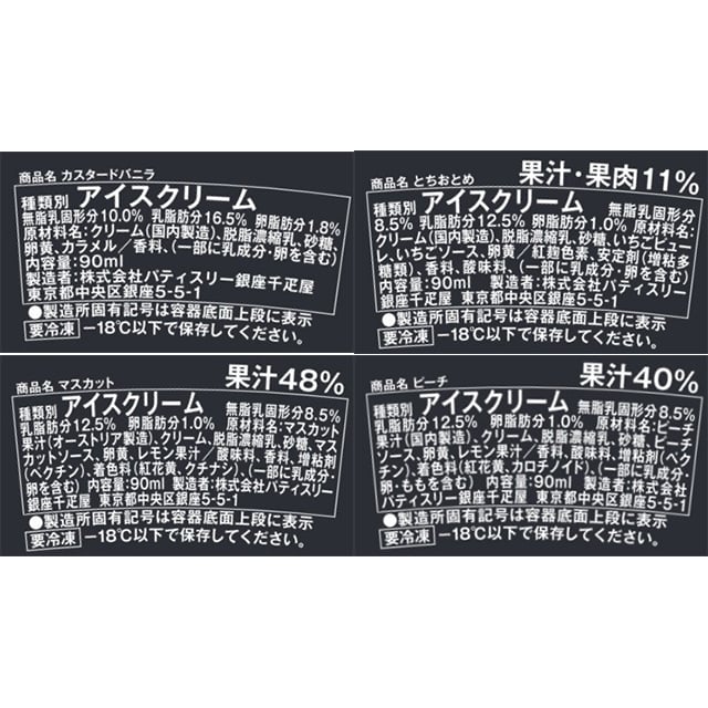 カスタードバニラ、とちおとめ、マスカット、ピーチ 各1個