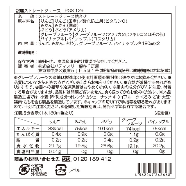 みかん・ぶどう・パイナップル・りんご・グレープフルーツ 各180mlx各2本 計10本