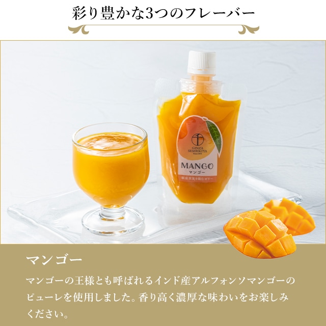 ・マンゴー:マンゴーピューレ(インド製造)、砂糖/ゲル化剤(増粘多糖類)、酸味料、酸化防止剤(ビタミンC)