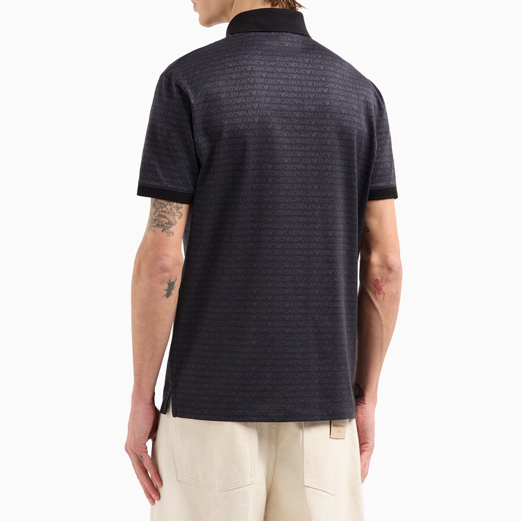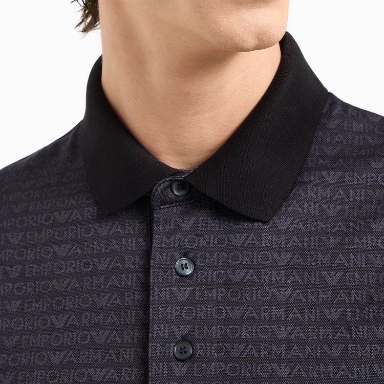 ピュアコットンのジャカードジャージーで仕立てたポロシャツ。全体にロゴレタリングをあしらった、高密度のモノクロパターンが特徴のテクスチャーです。