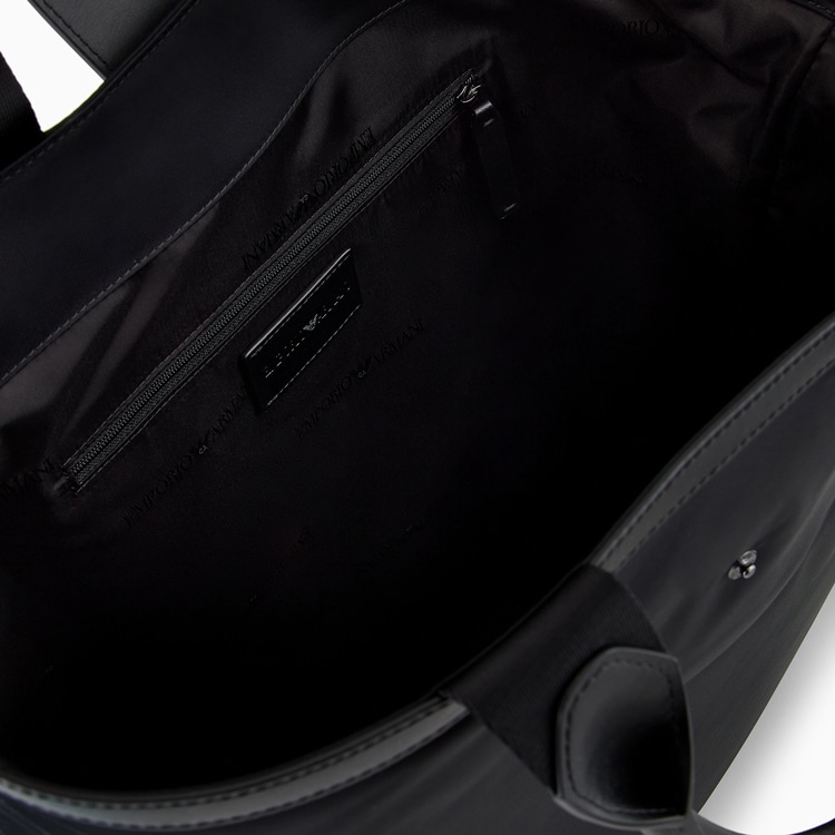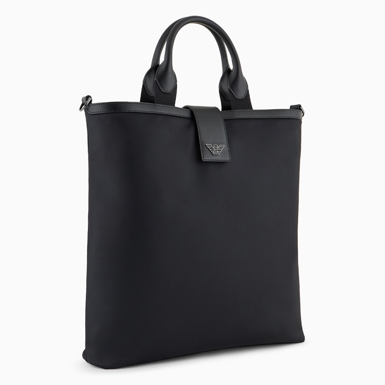 ダブルハンドルと取り外し可能なロゴ入りショルダーストラップを備えた、再生ナイロンのショッパー。開閉用のストラップに、イーグルロゴ形のメタルクラスプをあしらっています。