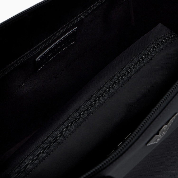 認証済みリサイクル素材から生まれたナイロンファブリックを使用し、再生レザーのディテールとイーグルロゴ形のメタルディテールをあしらいました。