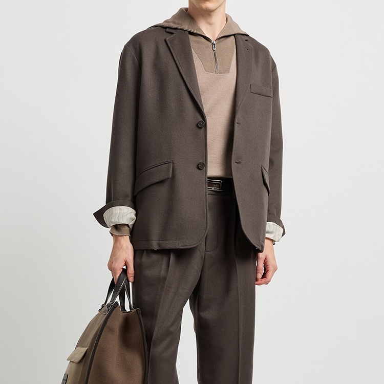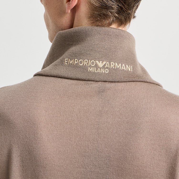 ワイドに折り返したネック部分の背面に、Emporio Armani Milanoの刺繍を施し、ウェアにさりげないエレガンスをプラスしています。