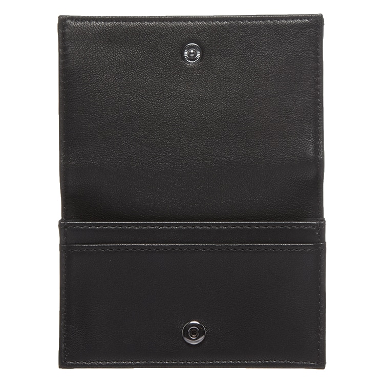 フラップをスナップボタンで留める、カウハイドのカードホルダー。内側にカードポケットを備えています。