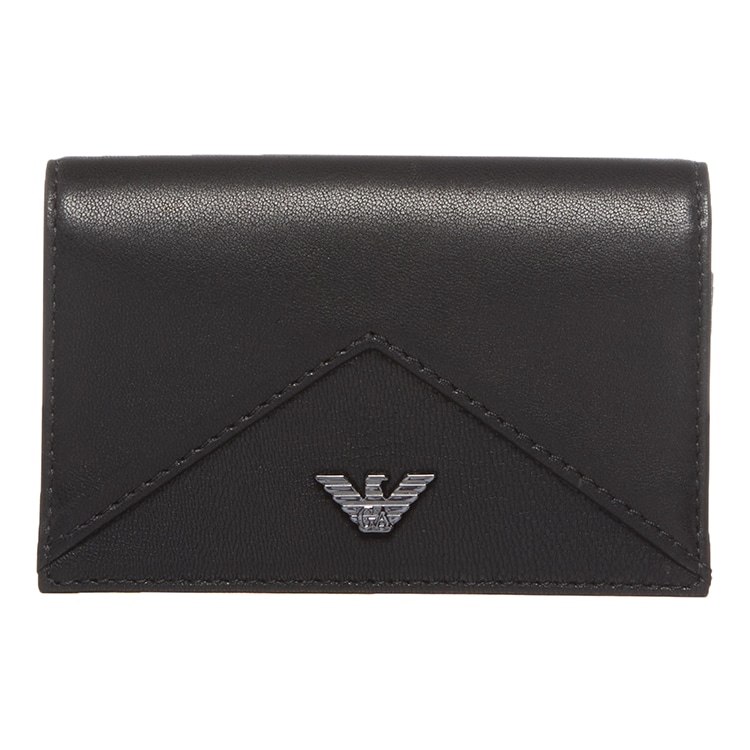 フラップをスナップボタンで留める、カウハイドのカードホルダー。内側にカードポケットを備えています。シンプルで洗練された、アルマーニの典型的なスタイルを体現するレザー小物です。モダンなスクエア形にデザインし、幾何学的な装飾ディテールをあしらいました。しなやかでナチュラルな風合いになめしたナッパレザーを使用しており、レザーの個体差が表れた不均一な質感が、各アイテム独自の特長となっています。仕上げにアイコニックなイーグル形のメタルディテールをあしらいました。