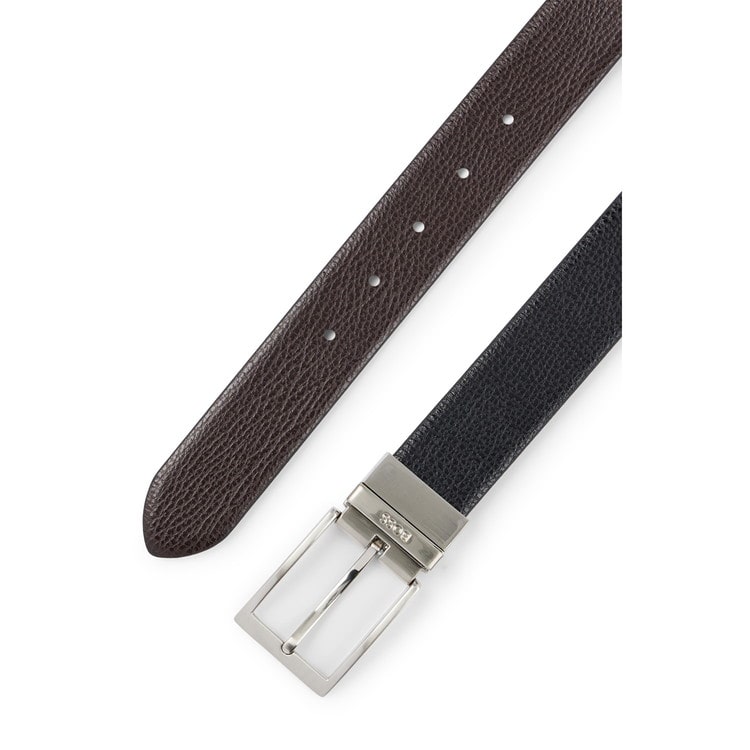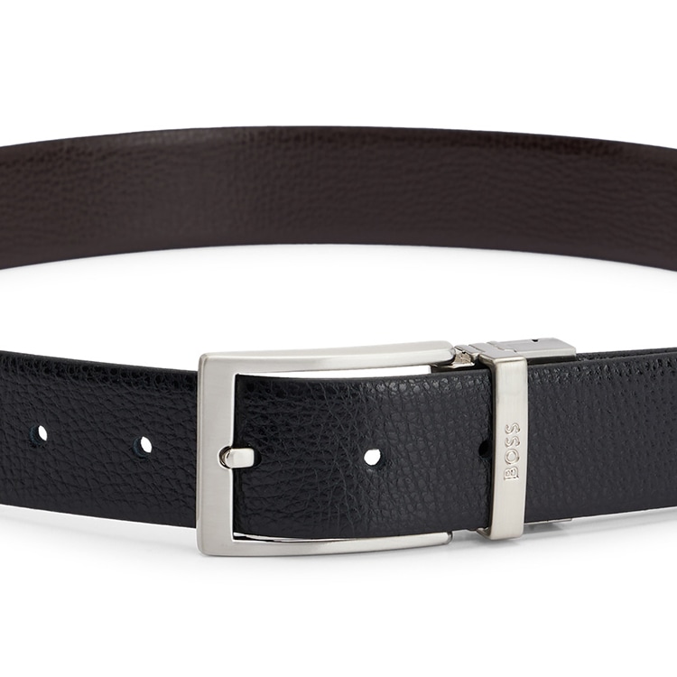 シボ入りのイタリアンレザーを幅3.5cmにカットし、帯革の両面を異なるカラーで仕上げています。ループにロゴを刻印しました。 HUGO BOSSは、より環境に配慮した責任ある商品の製造・加工方法を絶えず追求しています。こちらの商品には、認証済みタナリーから調達したレザーを60%以上使用しました。