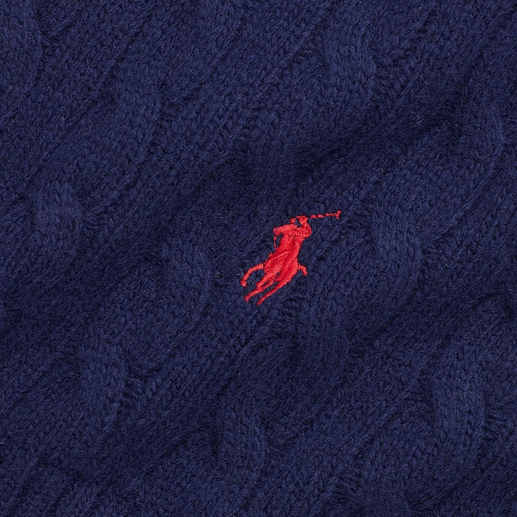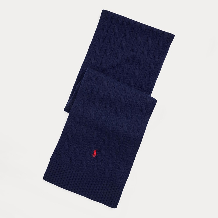 クラシックなケーブルニット構造に極細のメリノウールを使用し、シグネチャーのポニー刺繍で仕上げたマフラー。