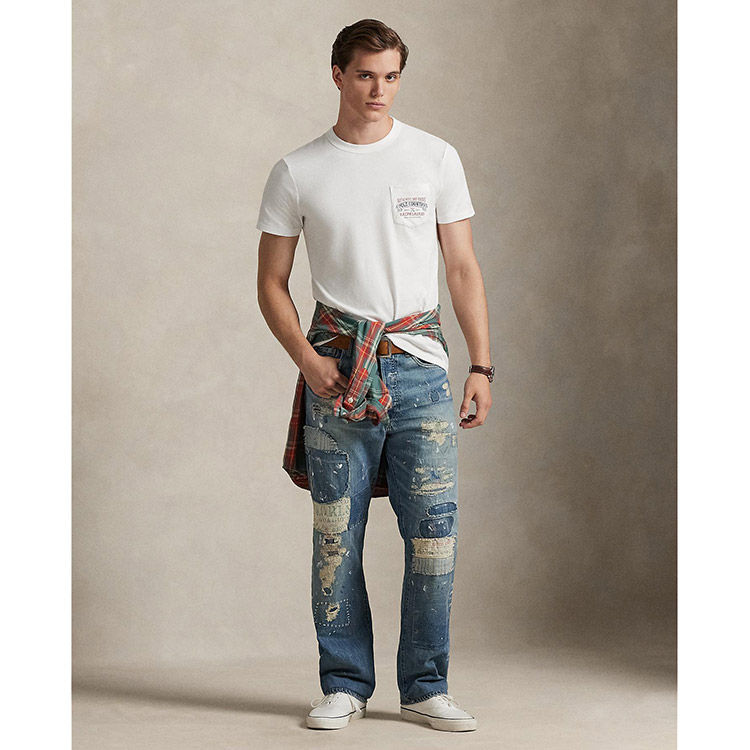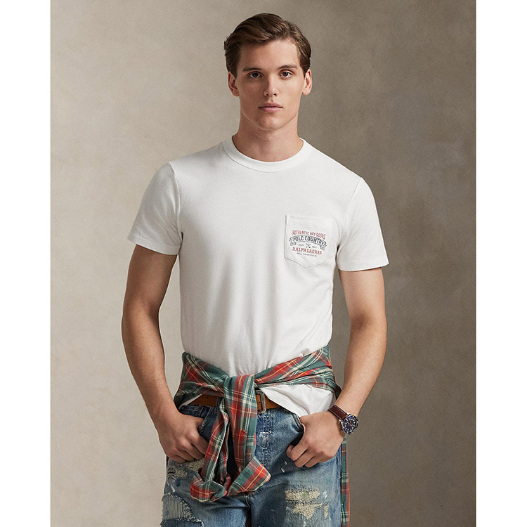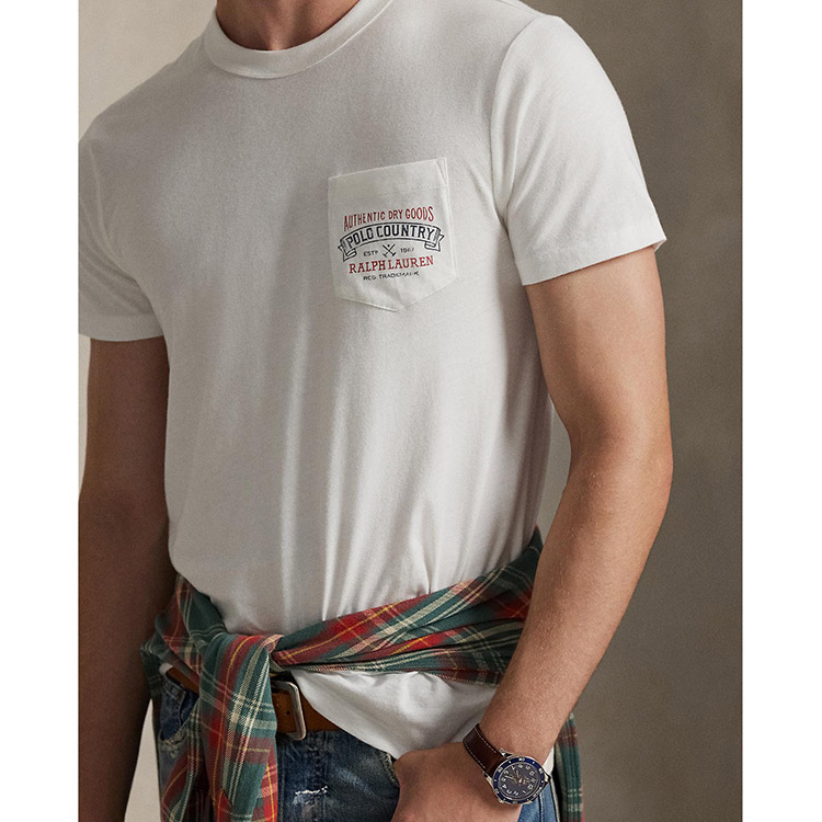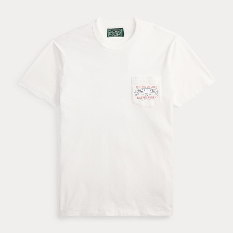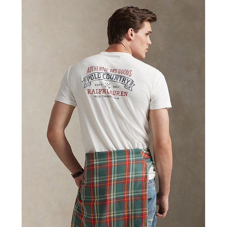 スラブ コットン ジャージーを使用し、1980年代後半のPolo Countryのラベルを再現したプリントを胸ポケットと背面にあしらったTシャツ。クラシックフィット:胸、ウエスト、袖にかけてゆったりとしたカット、肘上までかかる低いアームホール。クルーネック。半袖。左胸にパッチポケット。ポケットと背面中央に\"Polo Country Ralph Lauren\"のグラフィックのプリント。※生地や布張りの室内装飾品に色移りすることがあります。
