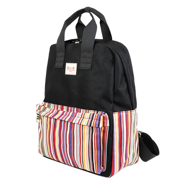 - 前ポケットとサイドに個性あふれるソレイユストライプを組み合わせ、ボディカラーとのコントラストが楽しいデザインです。