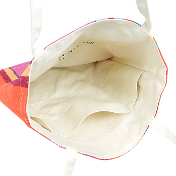 - 表面にはシンプルな無地生地(下部だけ柄あり)にゴールドのロゴ刺繍、裏面はソレイユストライプを使用した、