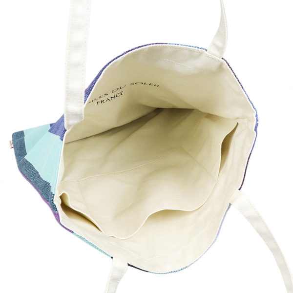 - 表面にはシンプルな無地生地(下部だけ柄あり)にゴールドのロゴ刺繍、裏面はソレイユストライプを使用した、