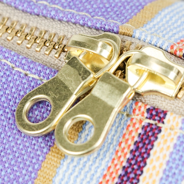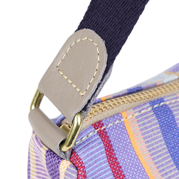 - ストライプの柄ごとに色を変えたレザーをあわせ、ロゴ文字をゴールドで刻印。