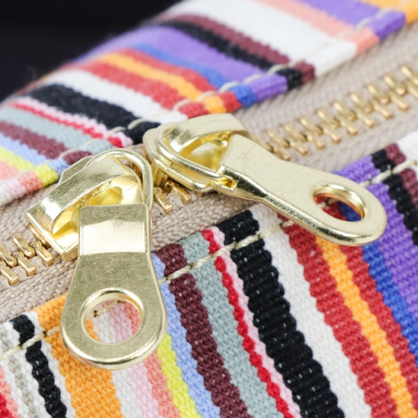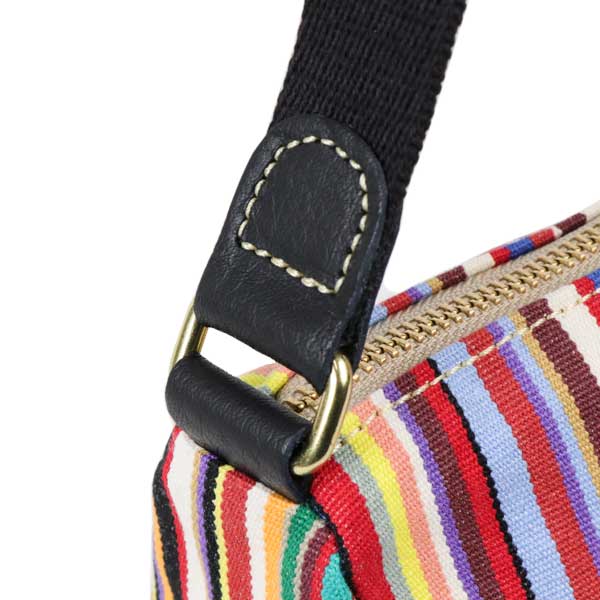 - ストライプの柄ごとに色を変えたレザーをあわせ、ロゴ文字をゴールドで刻印。