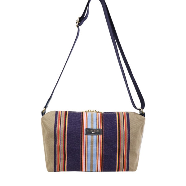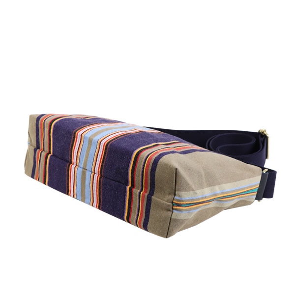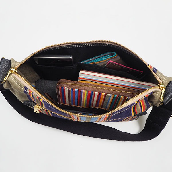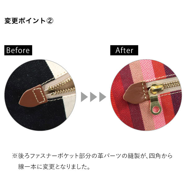 - ストライプの柄ごとに色を変えたレザーをあわせ、ロゴ文字をゴールドで刻印。
