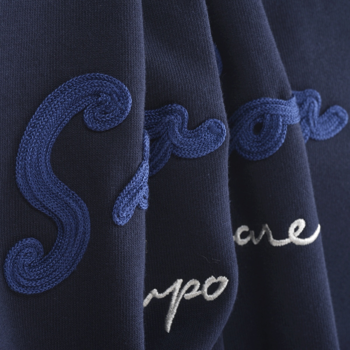 リリアンコード状に刺繍したシナコバロゴと衿元のカラー配色が特徴的なプルオーバーです。度詰裏毛の中肉タイプで毛羽立ちが少なくソフトで発色性の良い糸を使用したオリジナル素材を使用しています。また、編み方もひと工夫しており、きれいな生地を使用したフロントには、シナコバの刺繍を同系色で施しています。