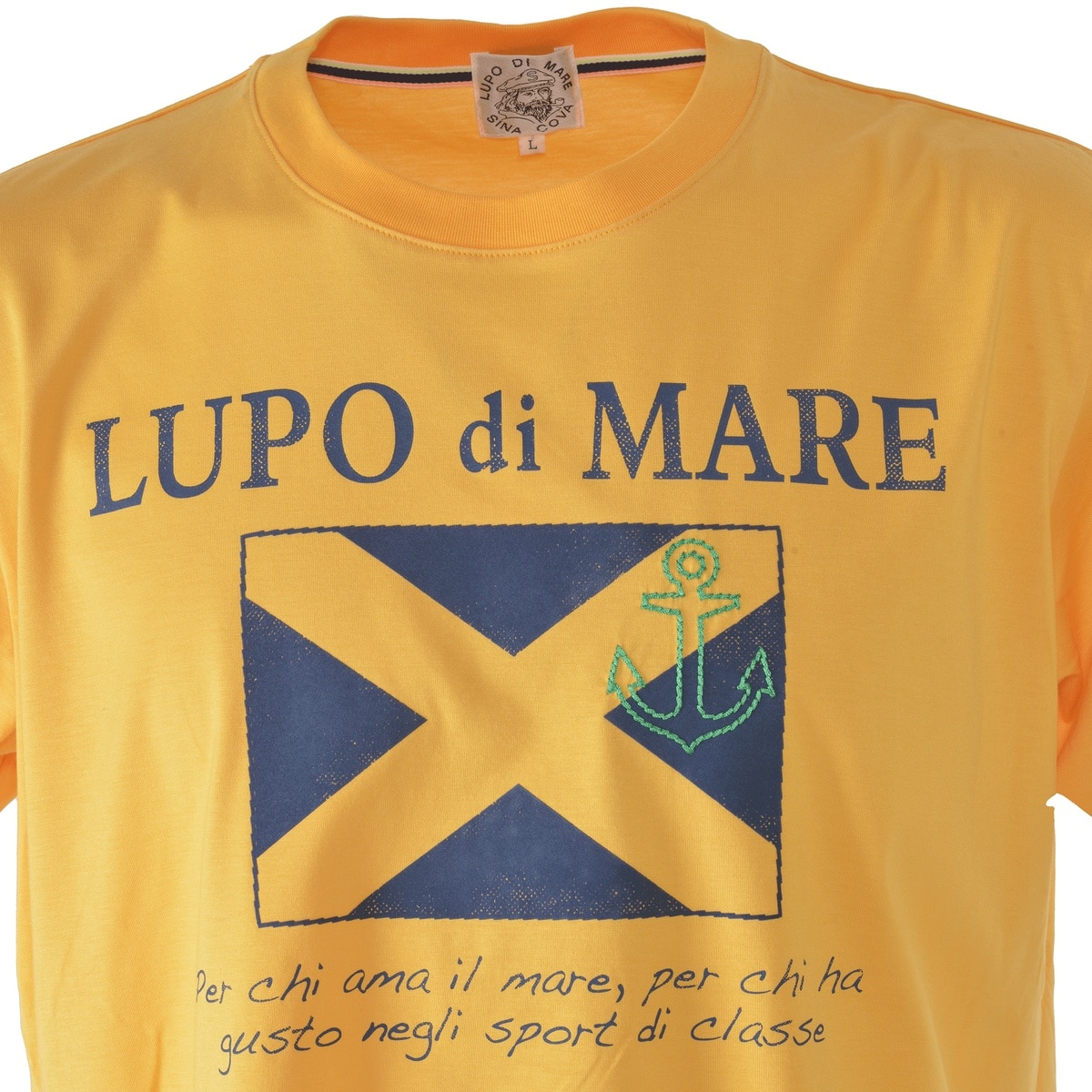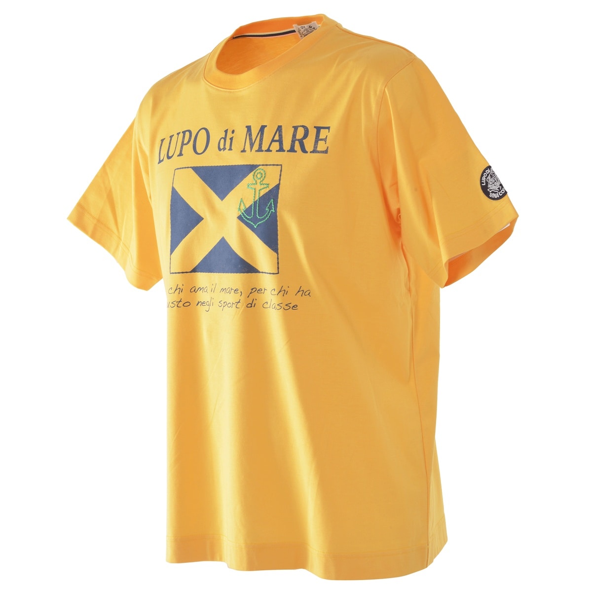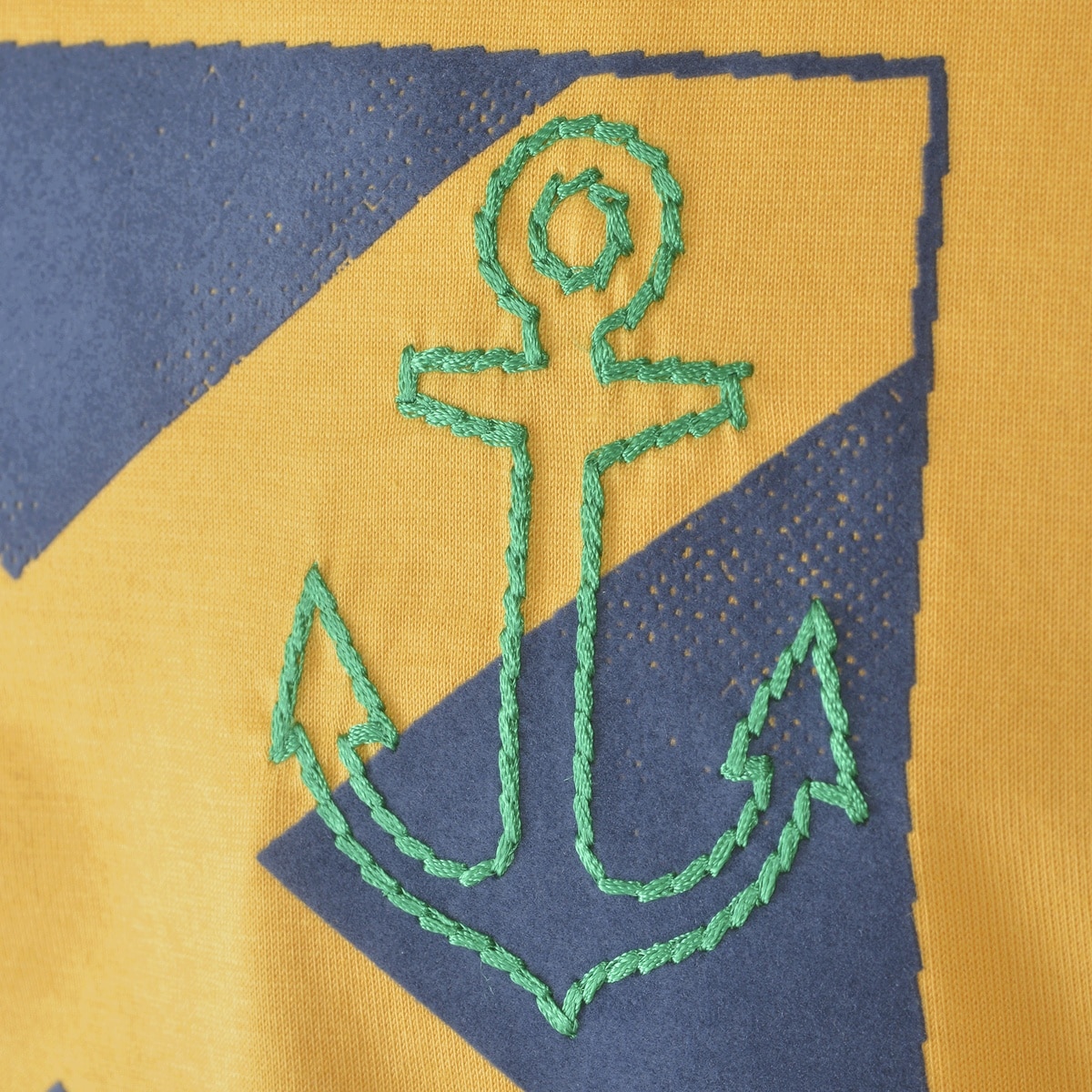 フロント胸部分に旗柄をフロッキー加工とラバープリント、刺繍で表現した半袖Tシャツです。