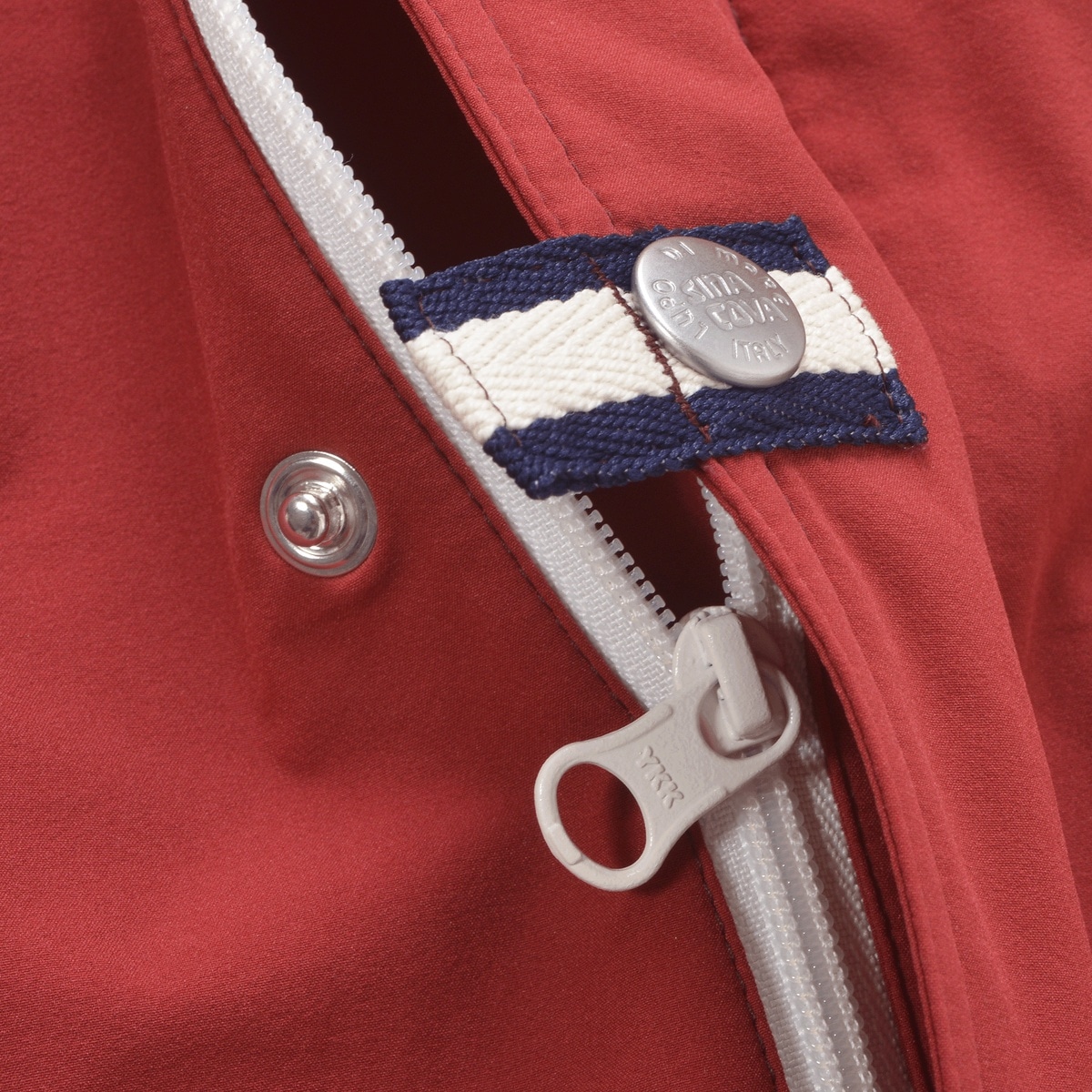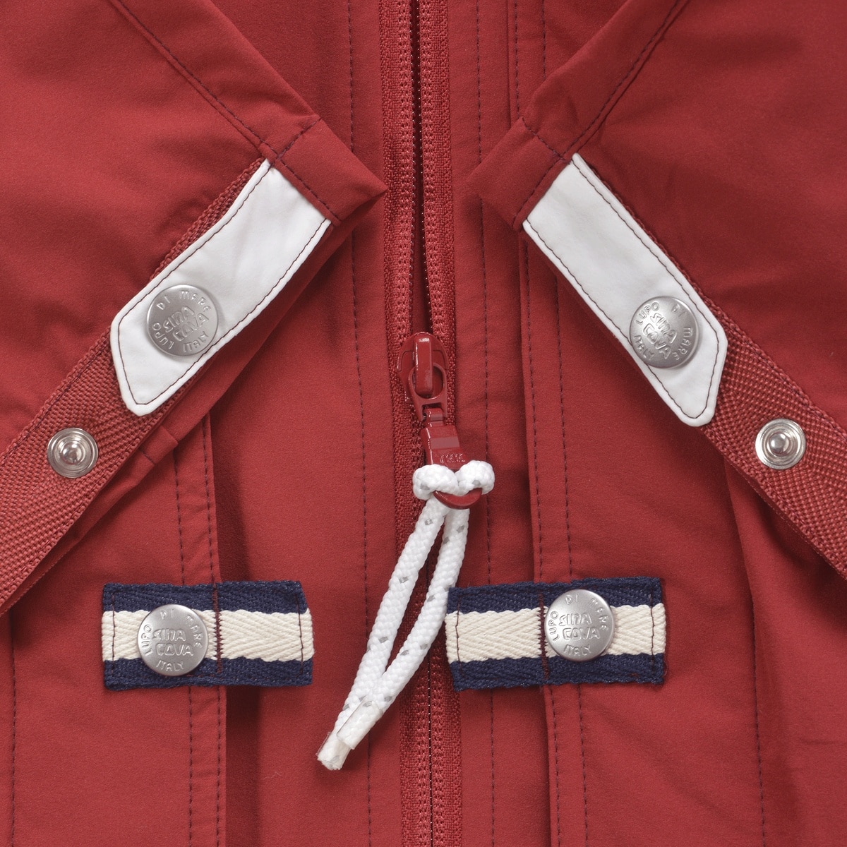 フロントのポケットは物が落ちにくい様スナップボタンとファスナーが付いた仕様になっており、生地は4方向に伸びる4WAYストレッチ素材を使用し撥水性も高くクルージングなどのマリンウェアとしてもお勧めです。
