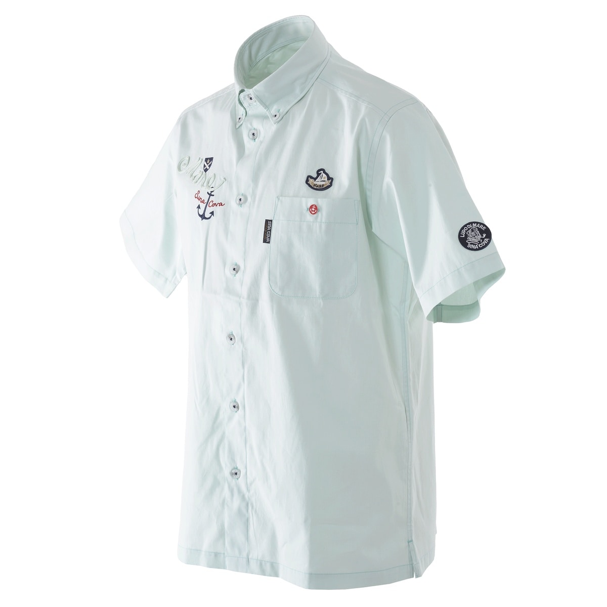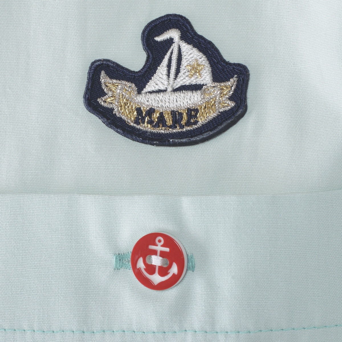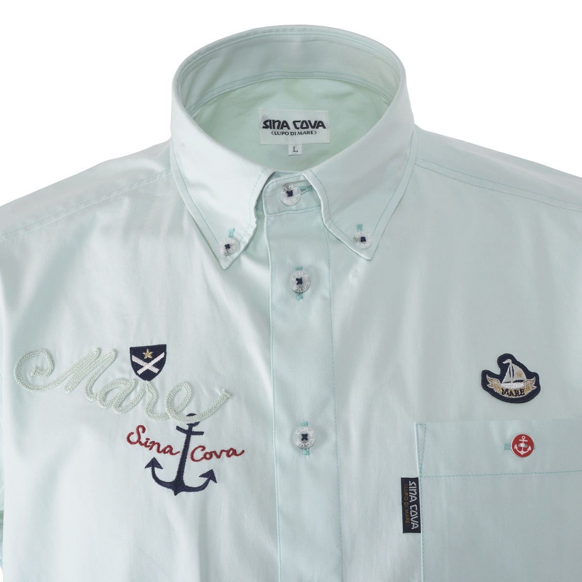 右胸にリリアンコードのMARE刺繍とイカリなどのマリンモチーフ、左胸ポケット上部にヨットの小ワッペンをあしらった半袖ボタンダウンTシャツです。