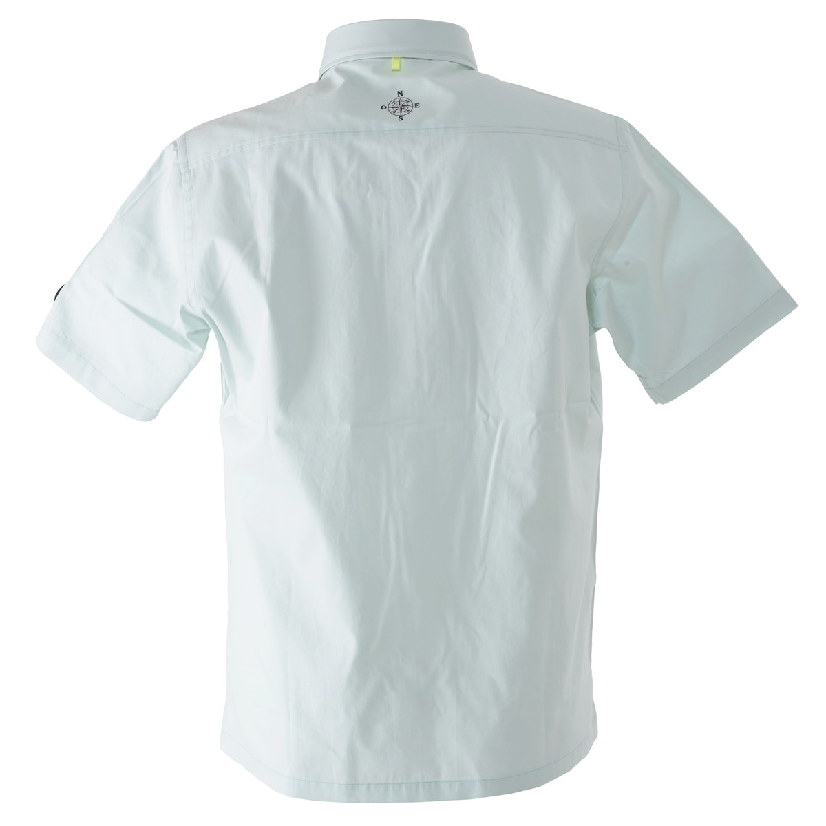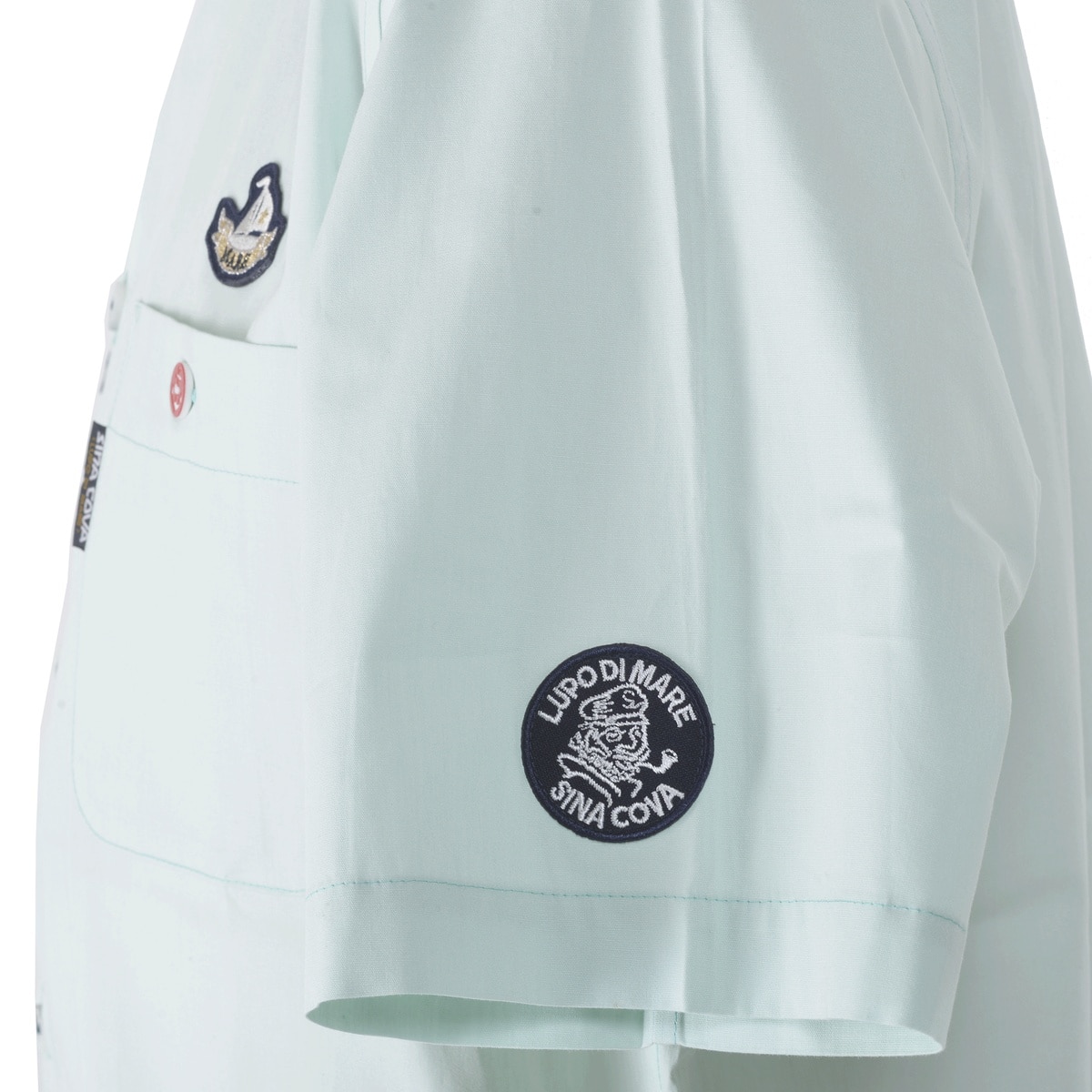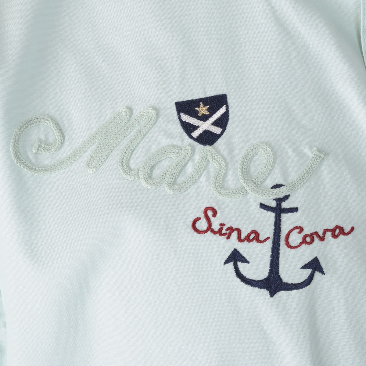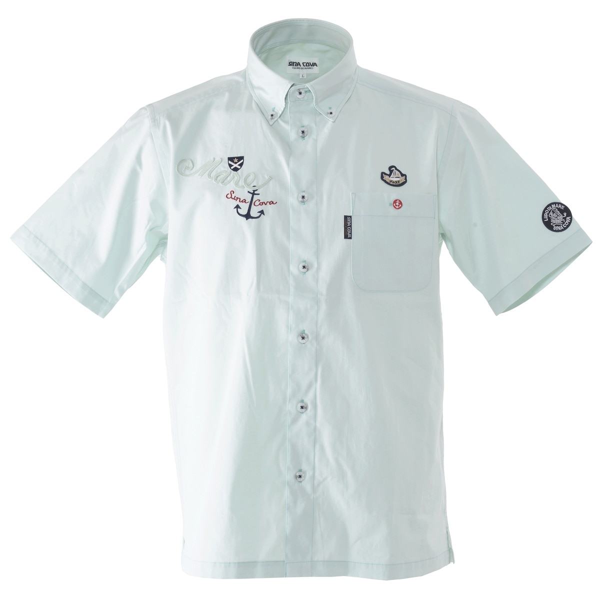 右胸にリリアンコードのMARE刺繍とイカリなどのマリンモチーフ、左胸ポケット上部にヨットの小ワッペンをあしらった半袖ボタンダウンTシャツです。