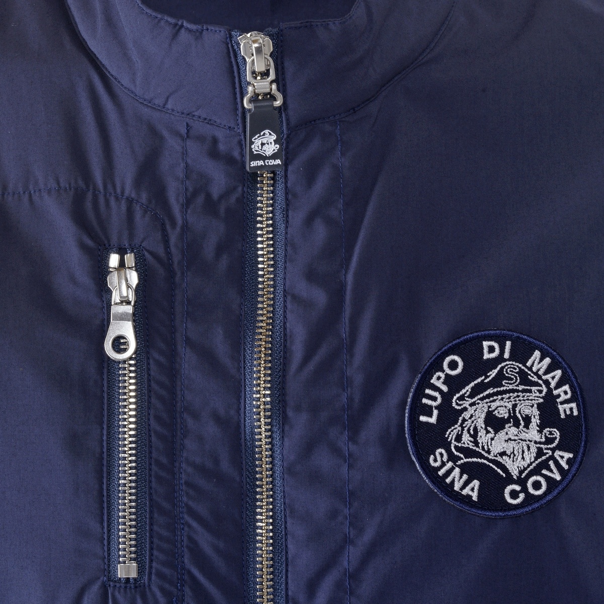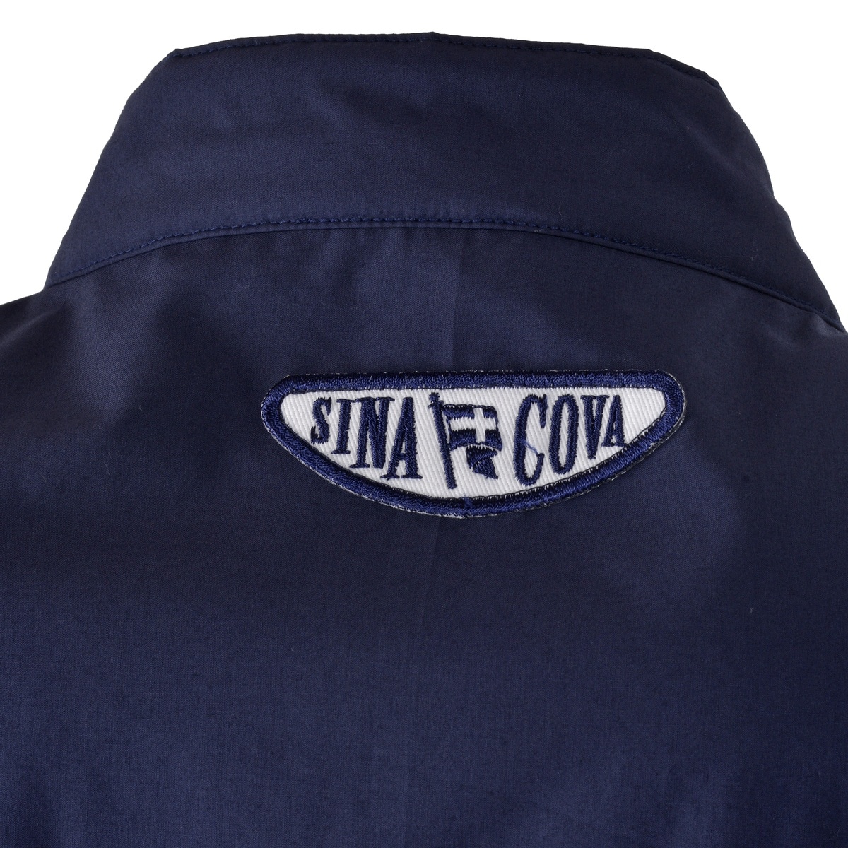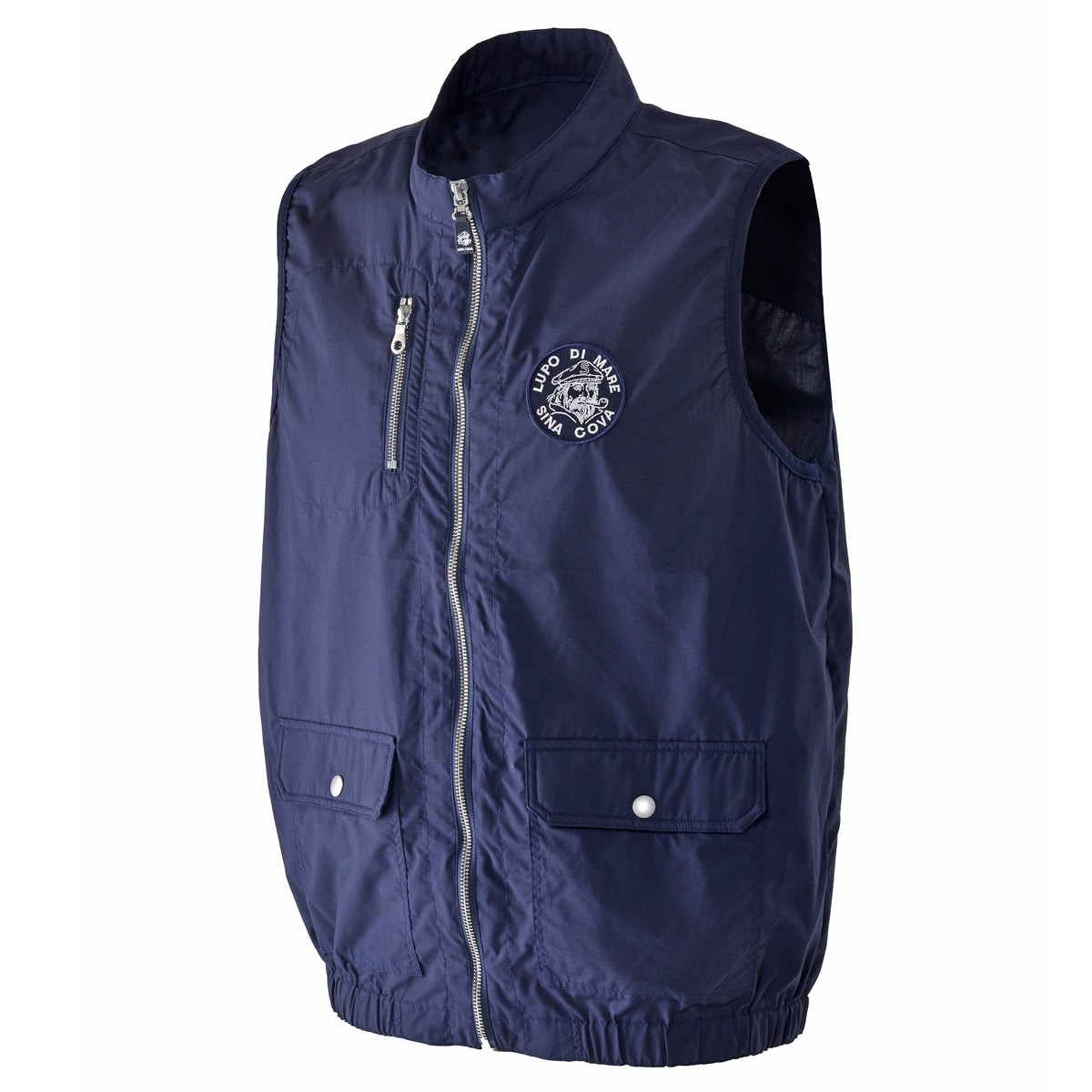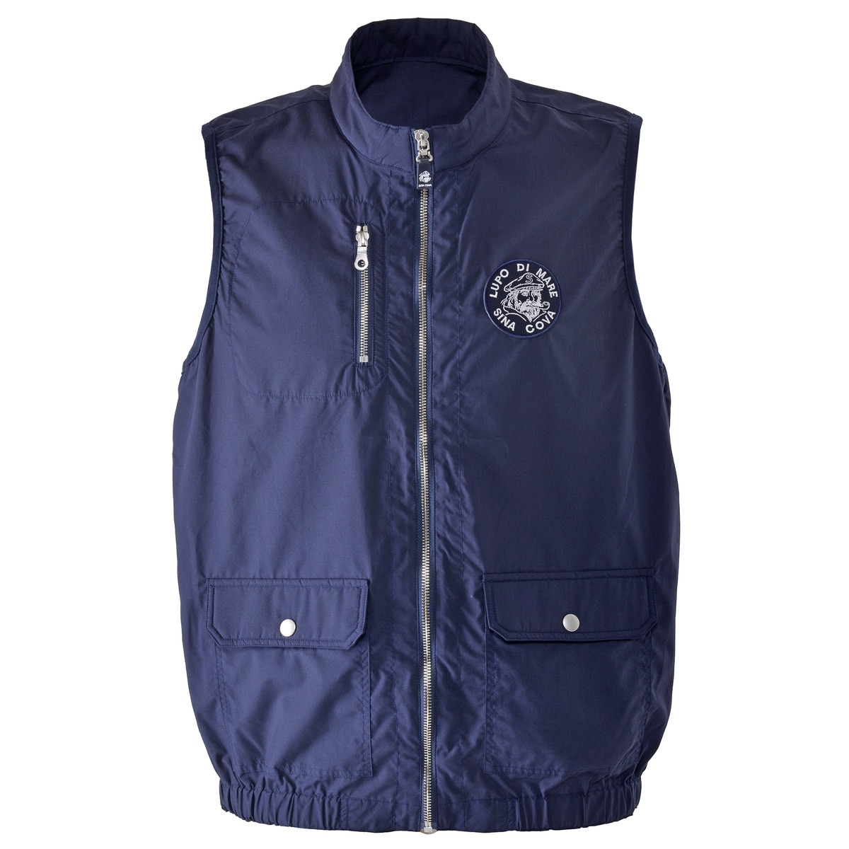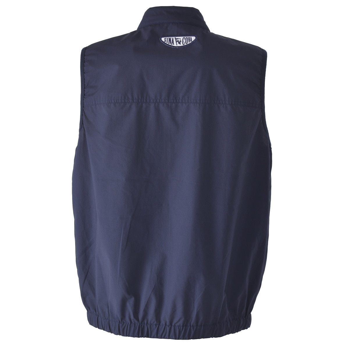 左胸にシナコバの特徴である中丸ワッペン、背ヨークにエンブレムワッペンが刺繍されたシンプルなフルジップベストです。