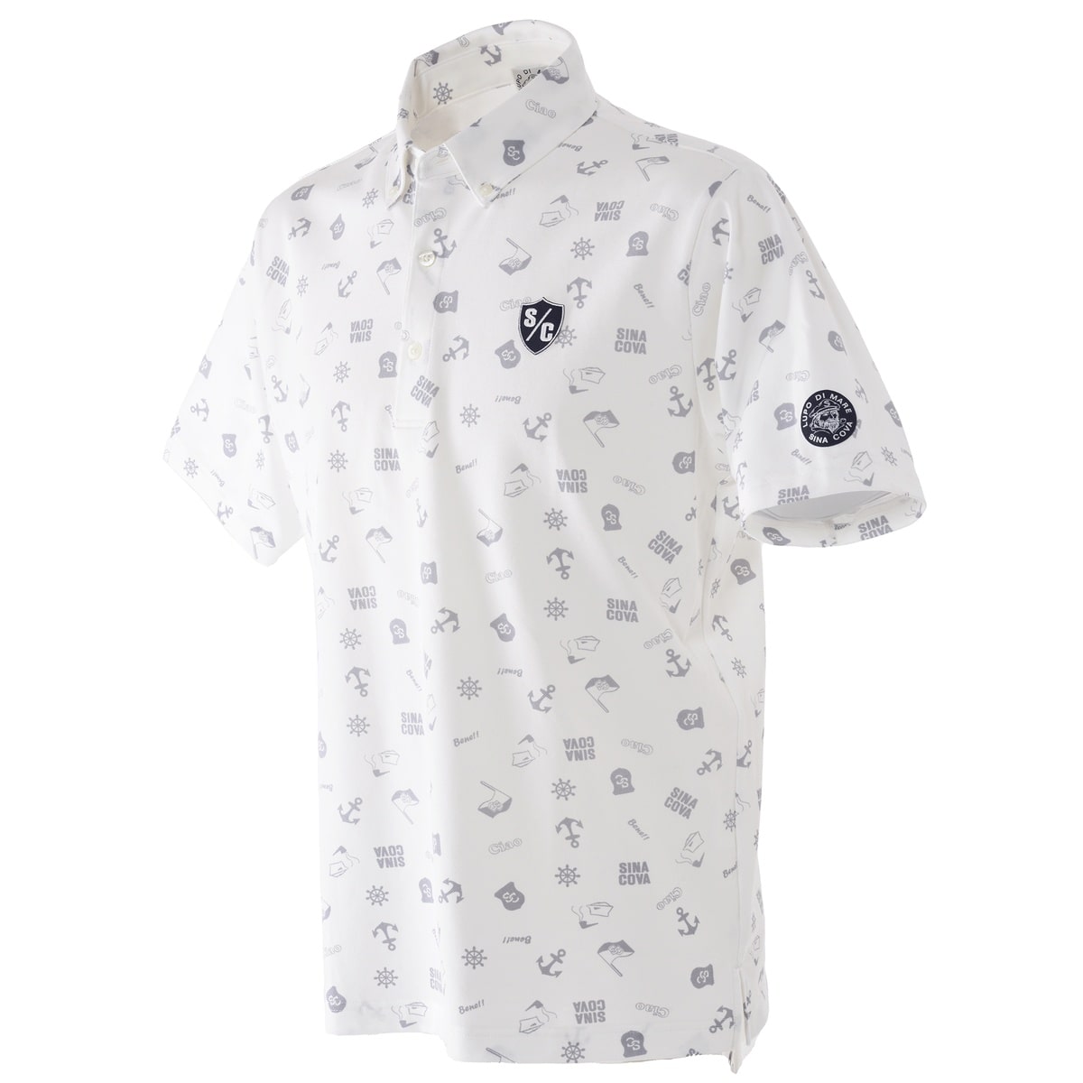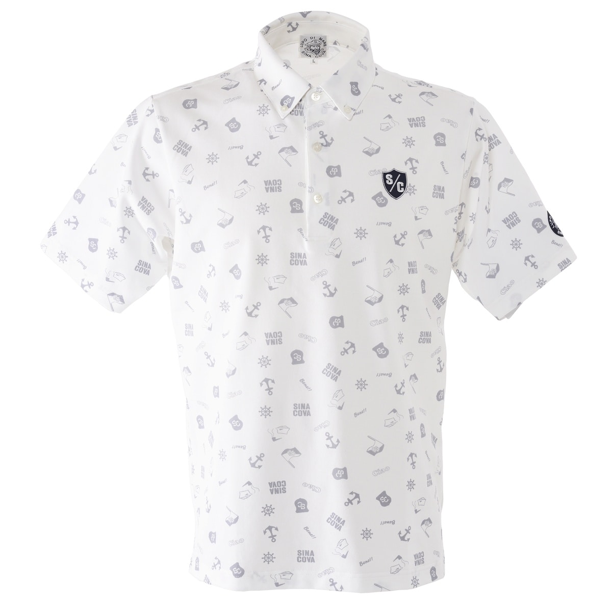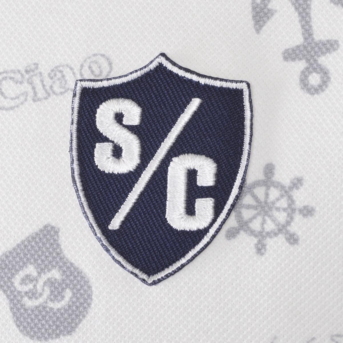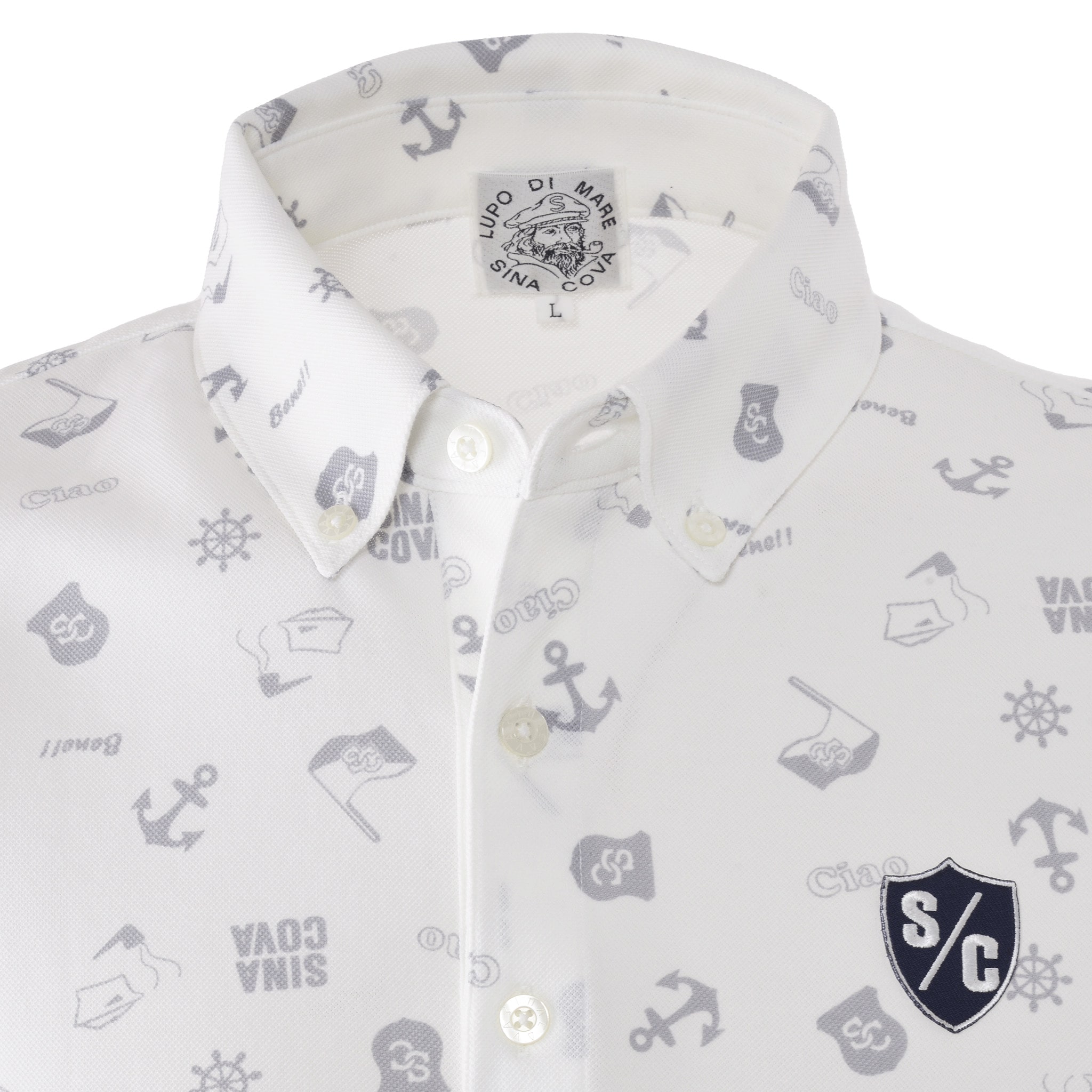 全体にイカリやパイプ、SCロゴなどのマリンモチーフをちりばめたPOP柄をあしらった、半袖ボタンダウンポロシャツです。