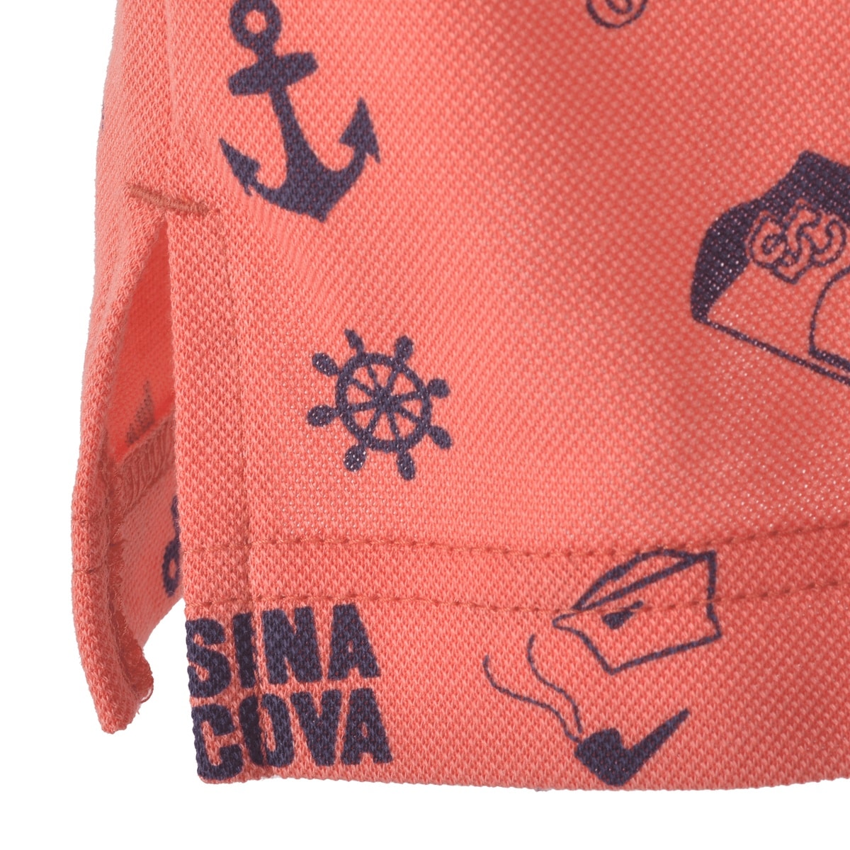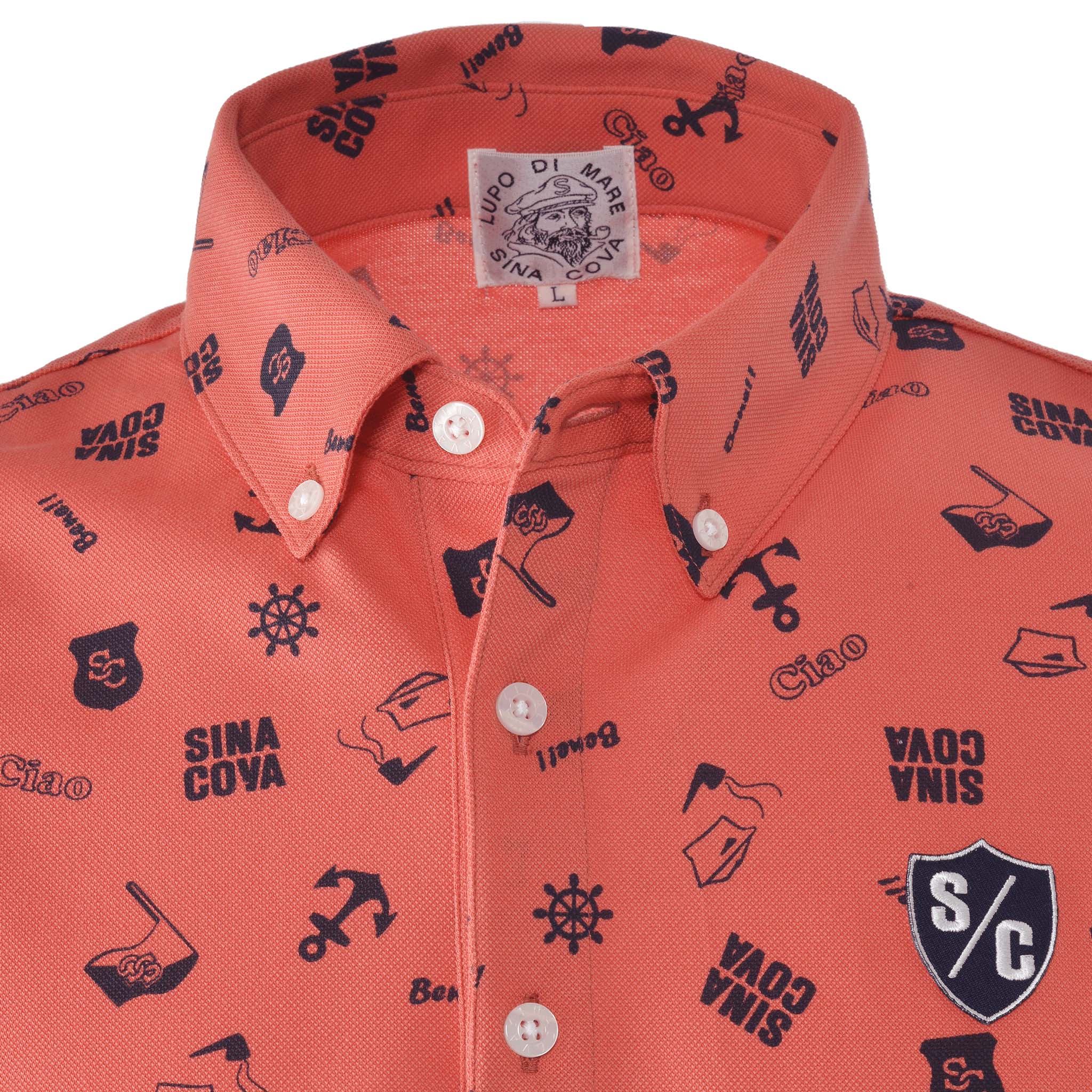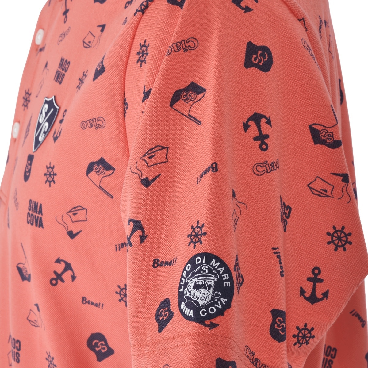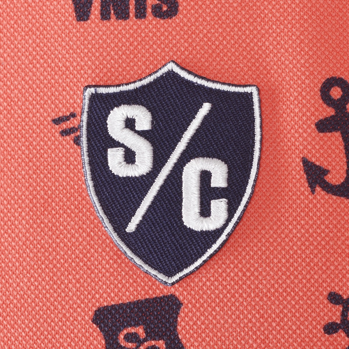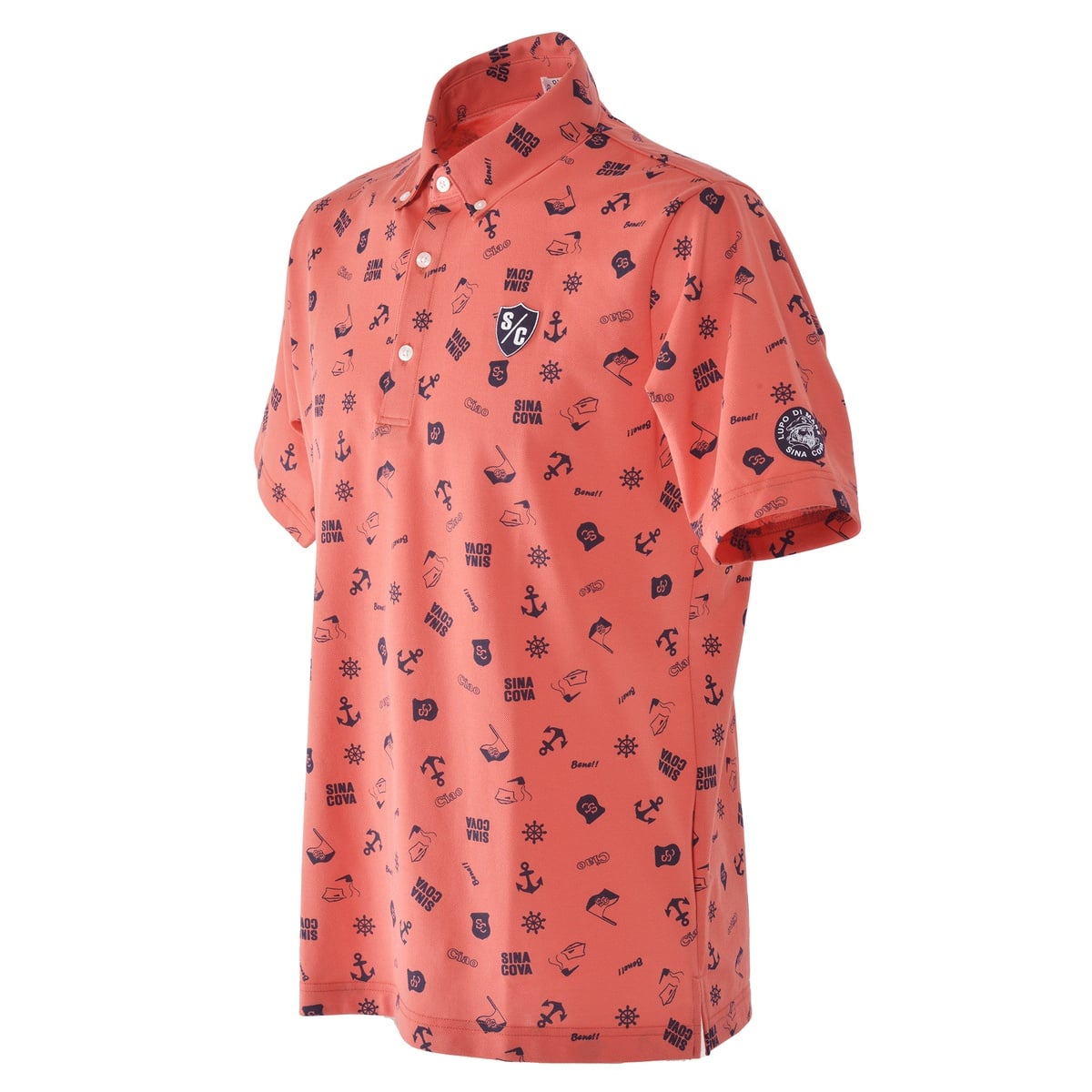 全体にイカリやパイプ、SCロゴなどのマリンモチーフをちりばめたPOP柄をあしらった、半袖ボタンダウンポロシャツです。