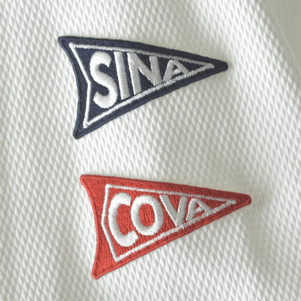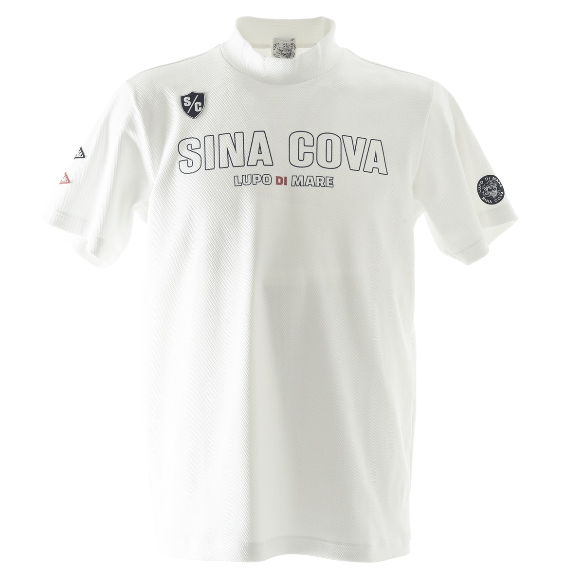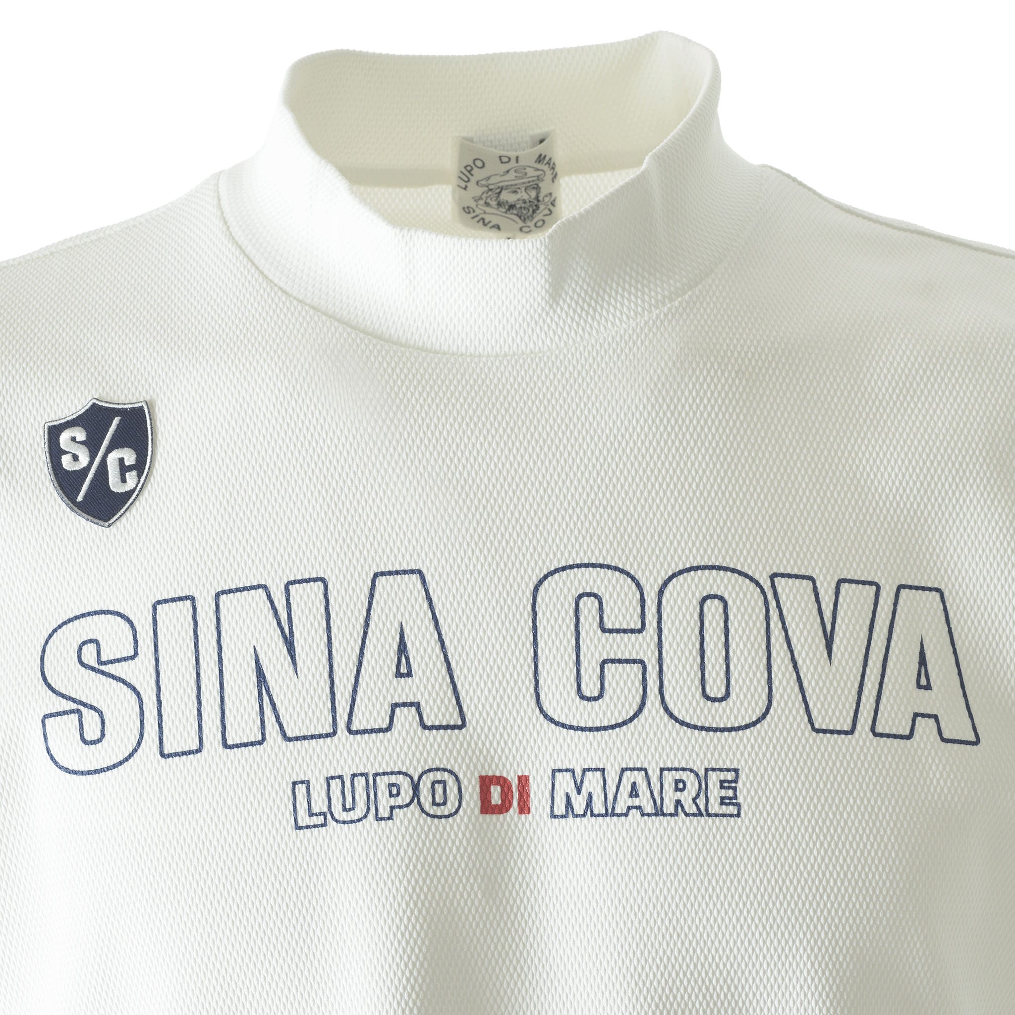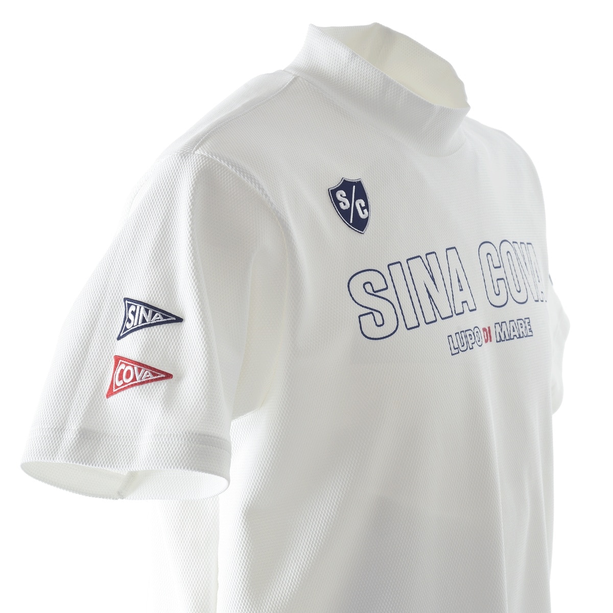 フロントにSINA COVA LUPO DI MARE(イタリア語:海の狼=パイプをくわえた船長)とSCロゴ、右袖部にSINA COVAのフラッグワッペン、左袖部に定番のシナコバロゴを施したハイネック半袖Tシャツです。