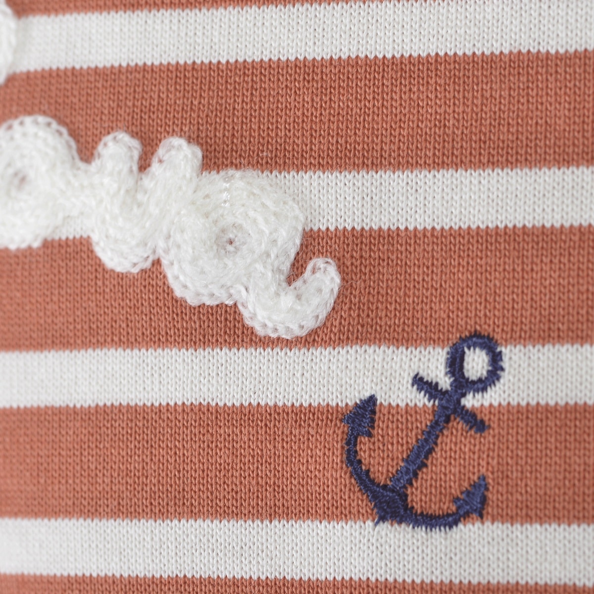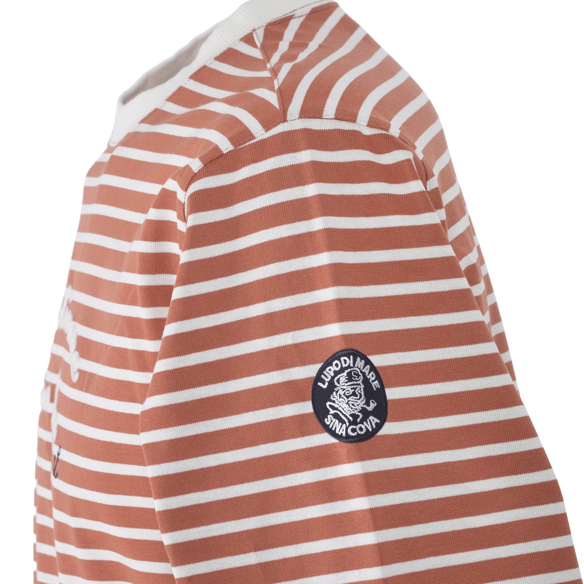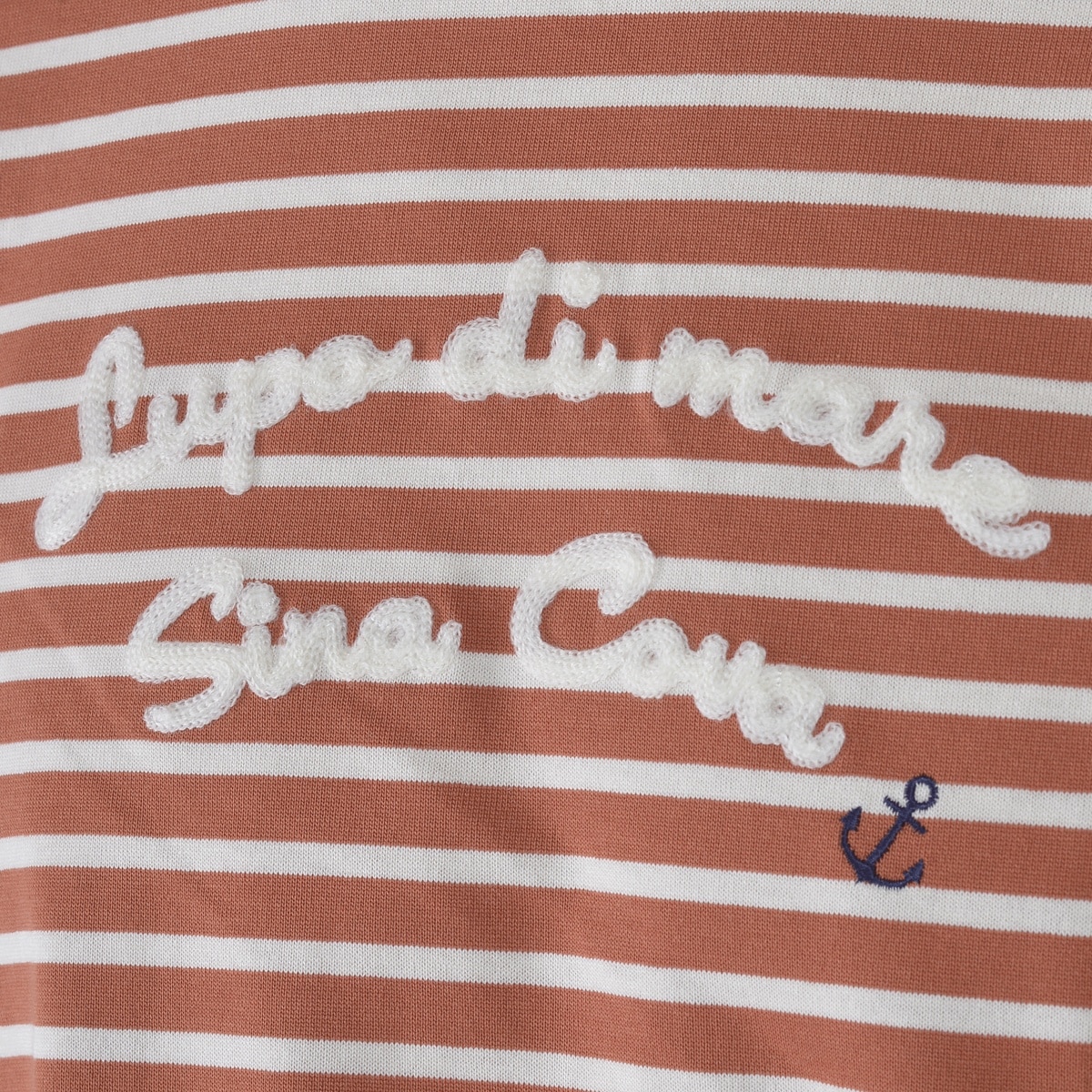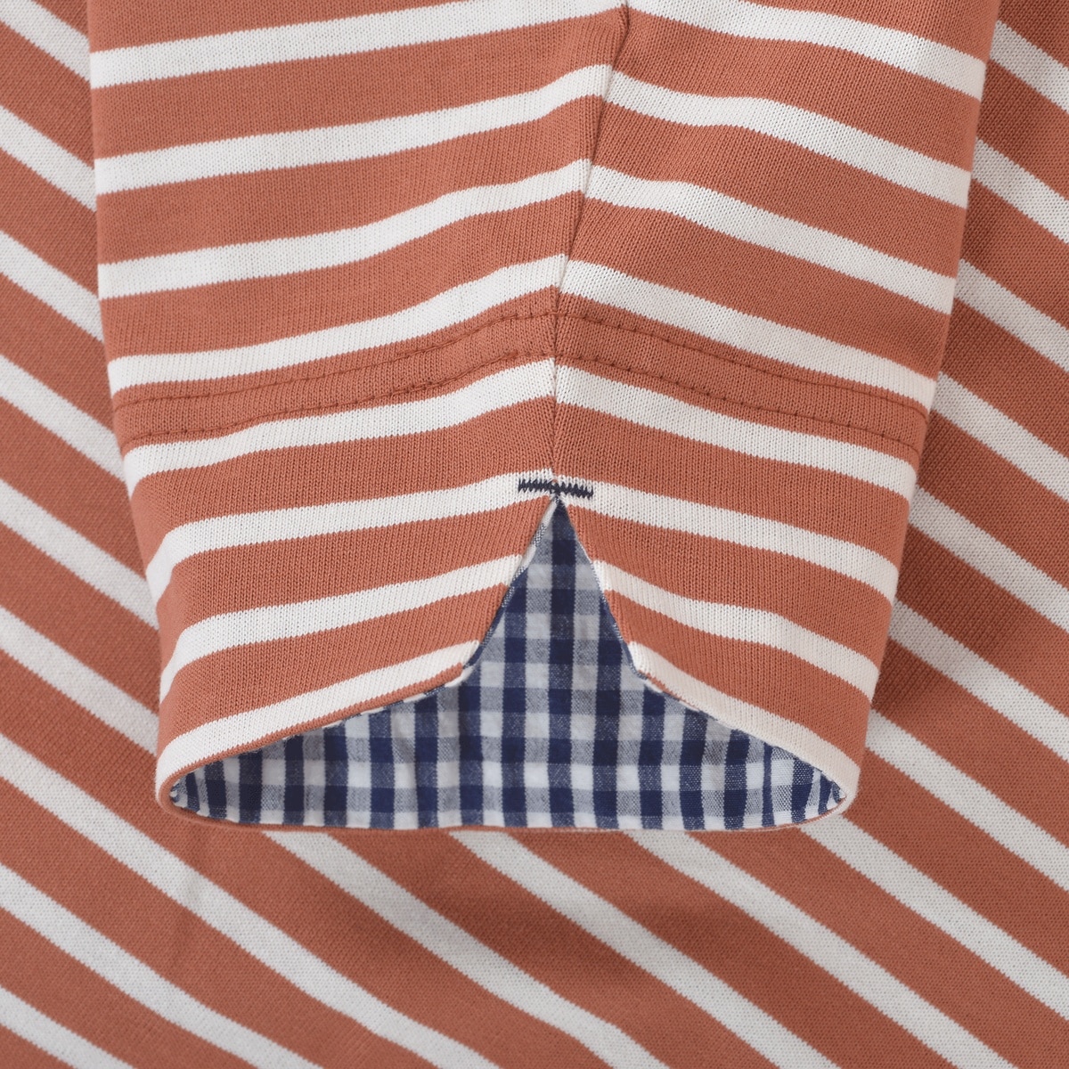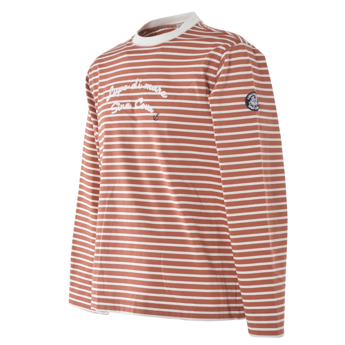 フロントに「LUPO DO MARE」「SINA COVA」のチェーンステッチ刺繍、袖裏にはギンガムチェックの別生地をデザインしたボーダー長袖Tシャツです。