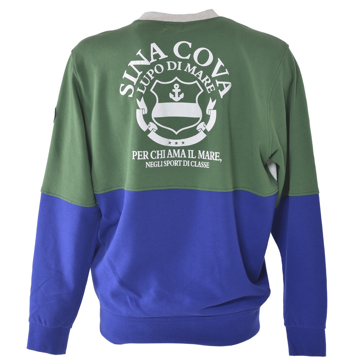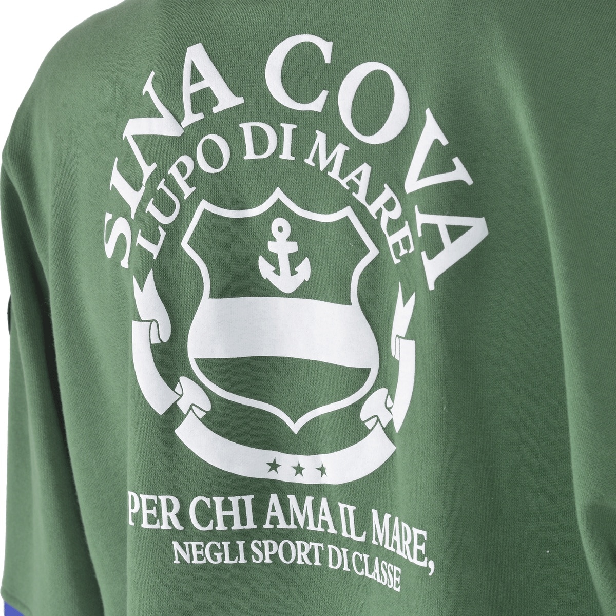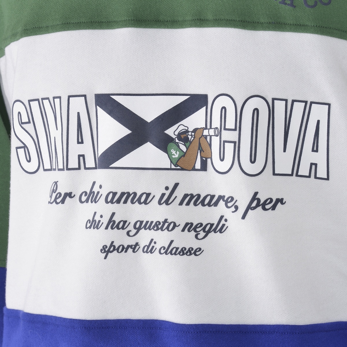 クラブチームのユニフォームのようなシナコバオリジナルのプリントをデザインした切替トレーナーです。シナコバらしいきれいな発色と配色は一枚着でも存在感のある一着です。素材にはコーマ糸ミニ裏毛の薄過ぎず厚過ぎない生地を使用し長いシーズン使用できるトレーナーです。・薄過ぎず厚過ぎないスウェット生地・切り替えデザイン・バックプリント有り・春・秋・冬のロングシーズン使用可能