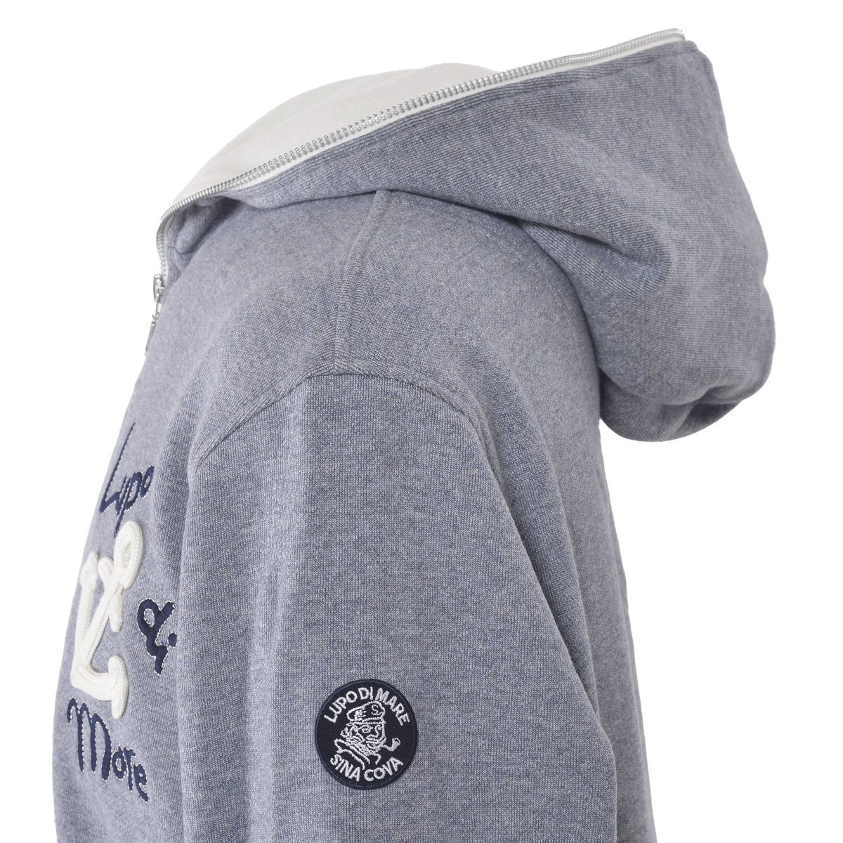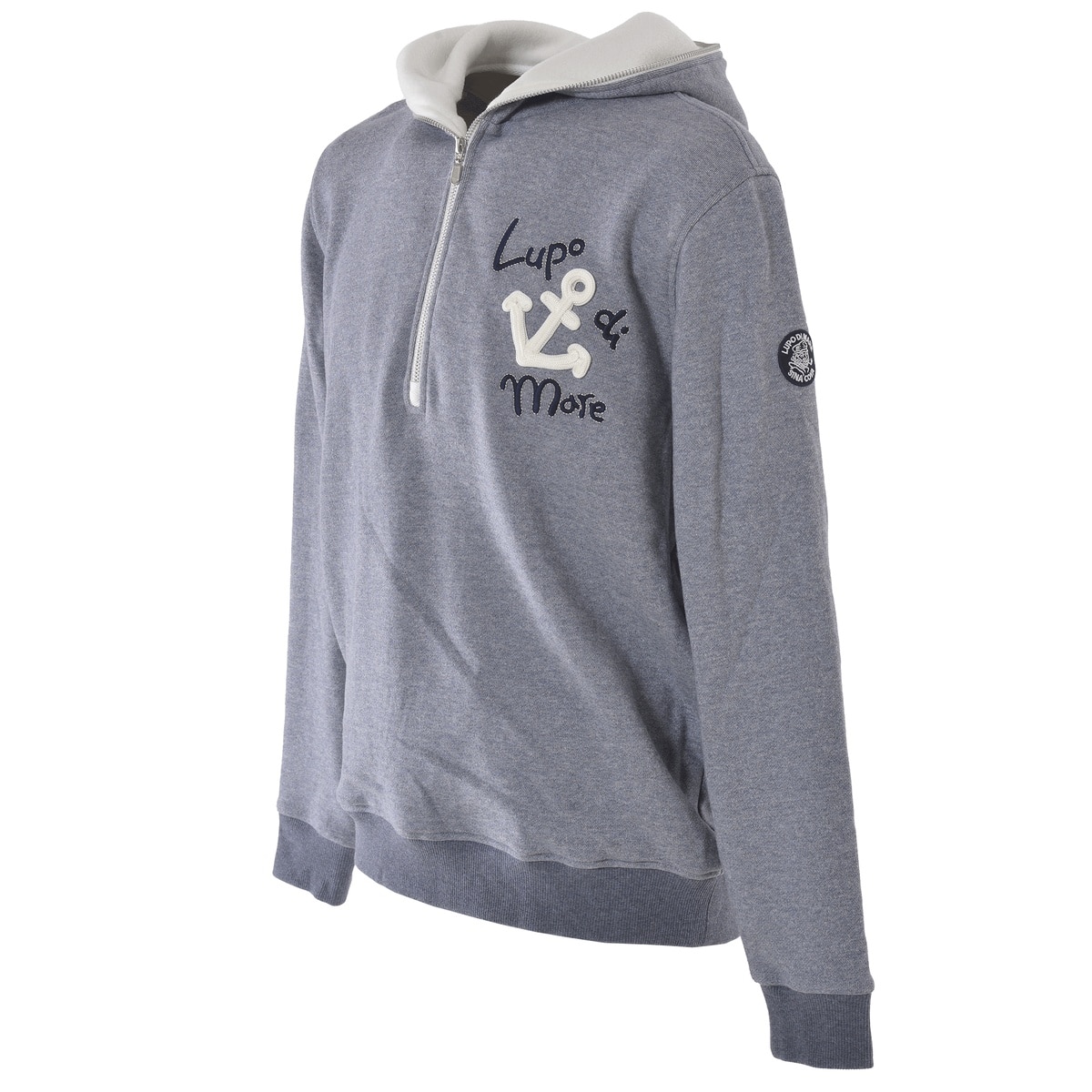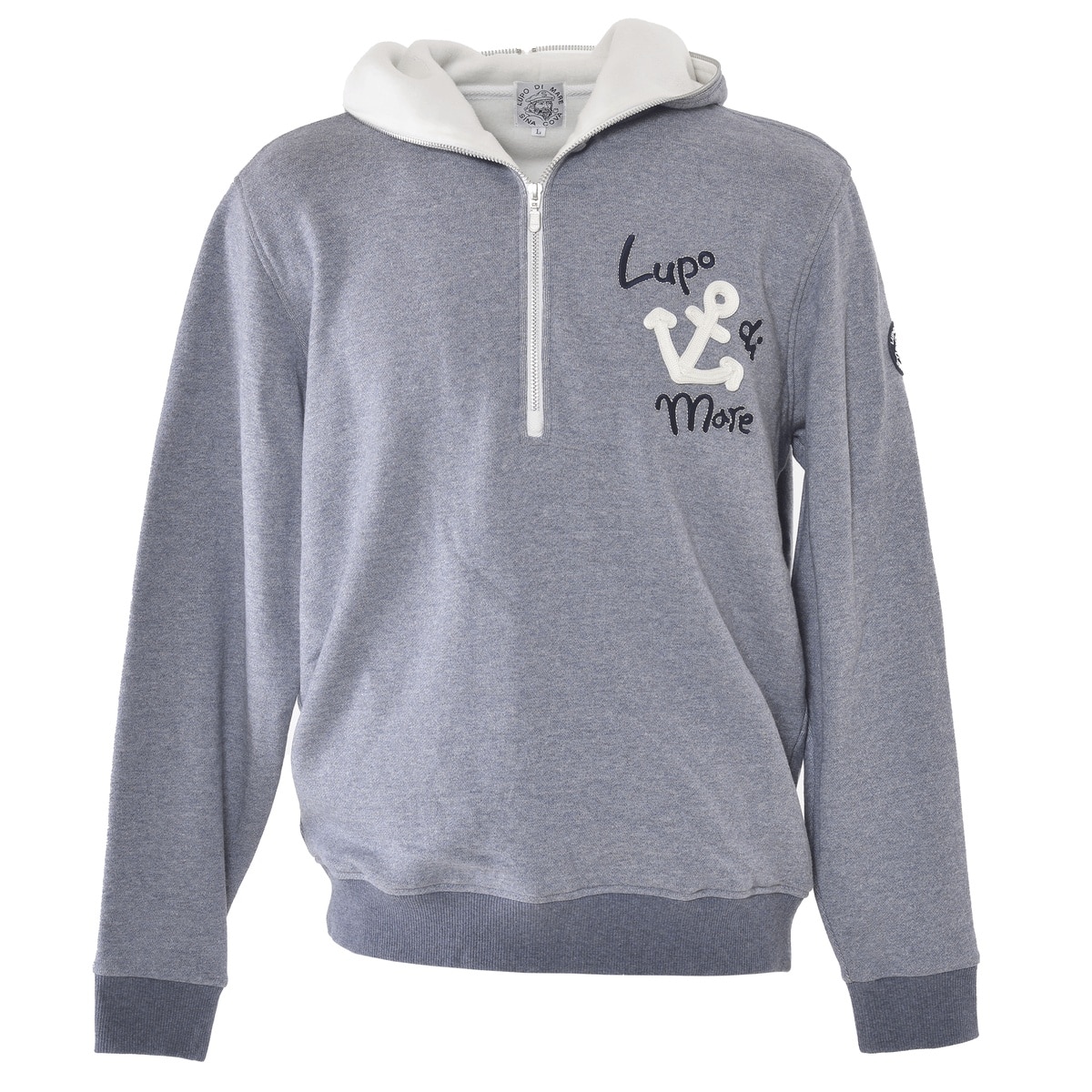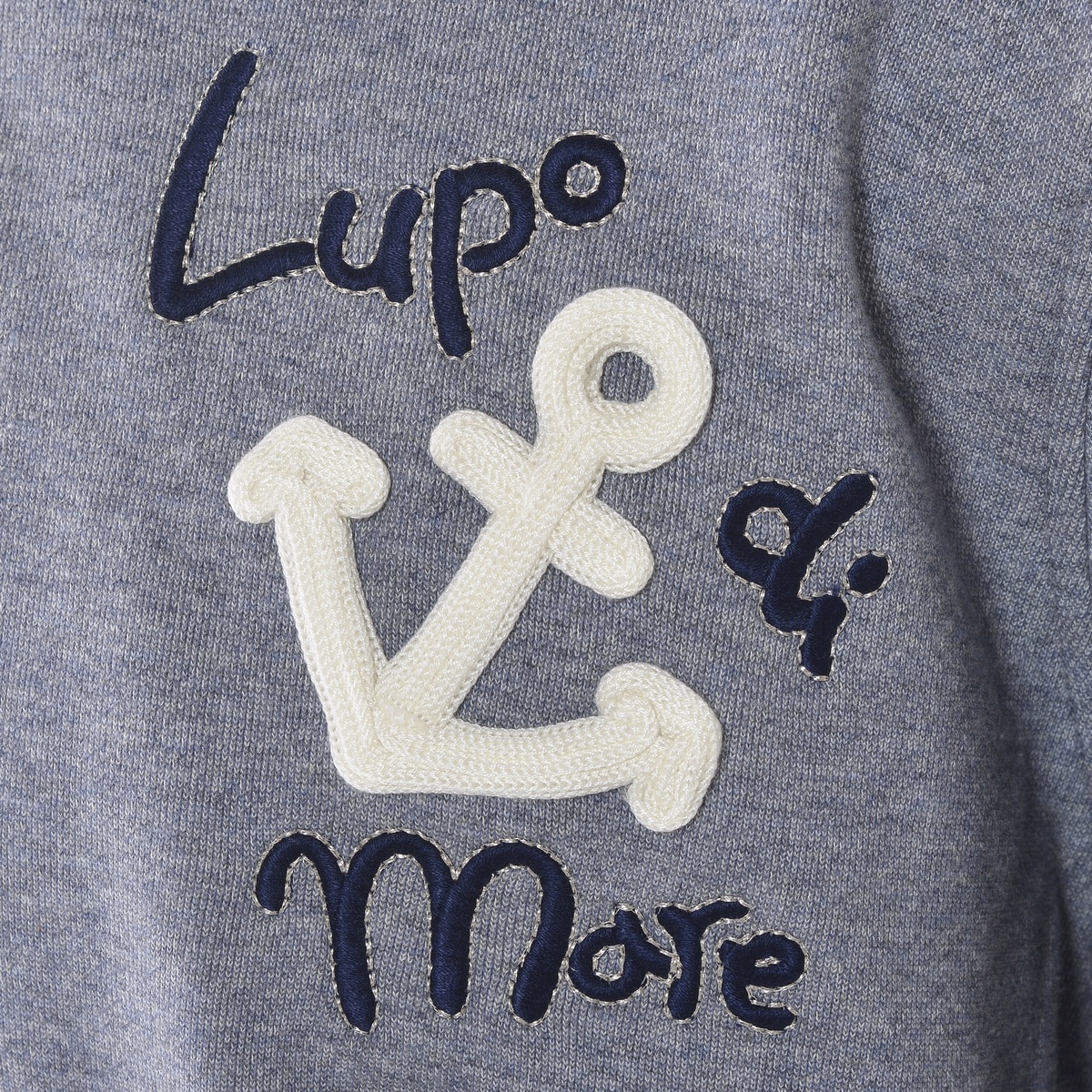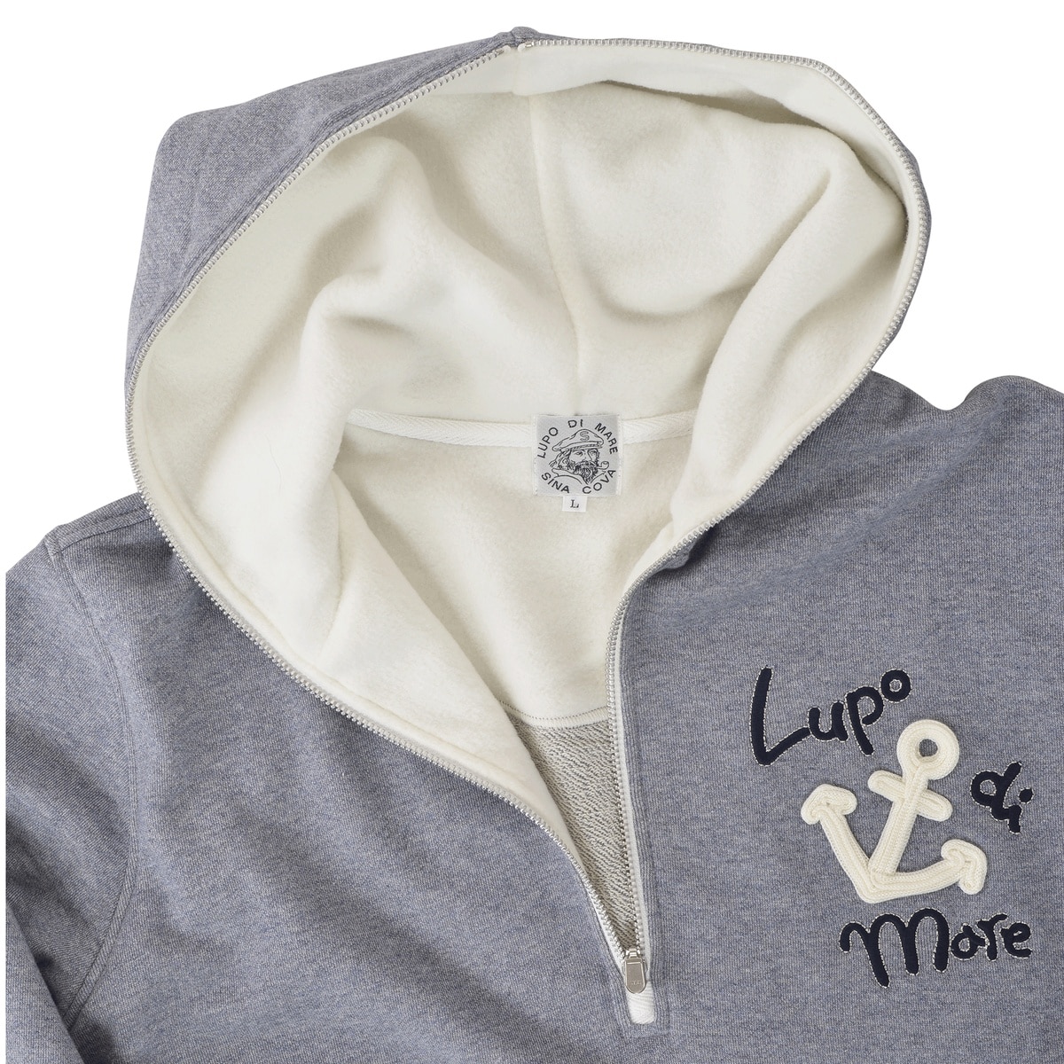 フロントに「LUPO DO MARE」とイカリの刺繍、フードにはフルZIPをデザインしたハーフZIPパーカーです。