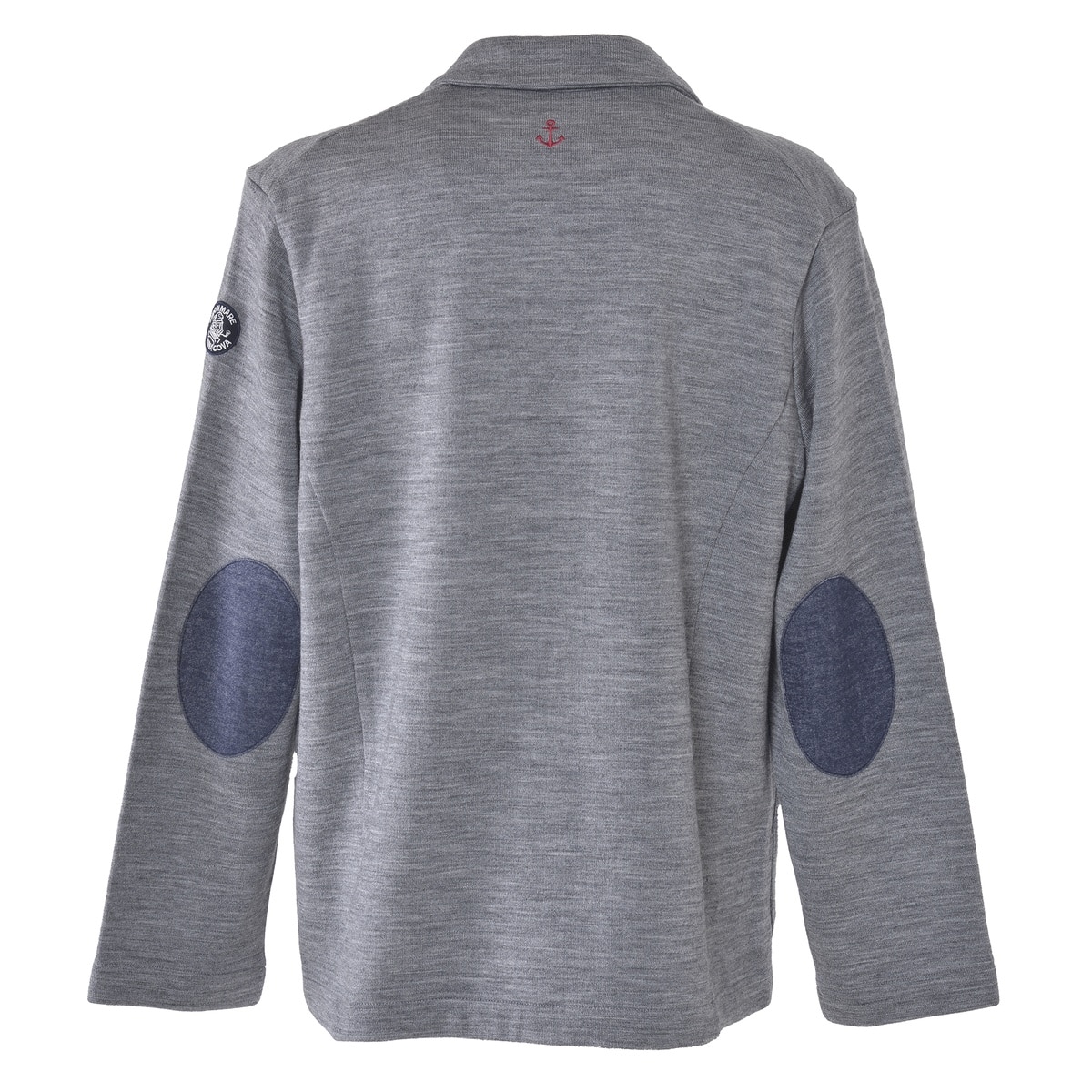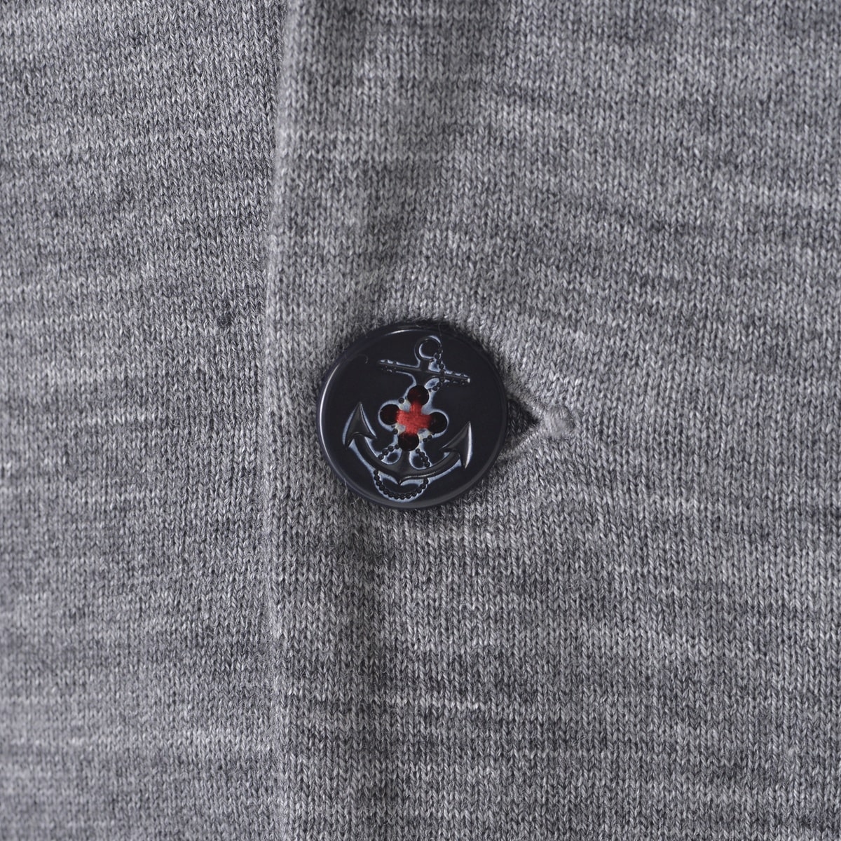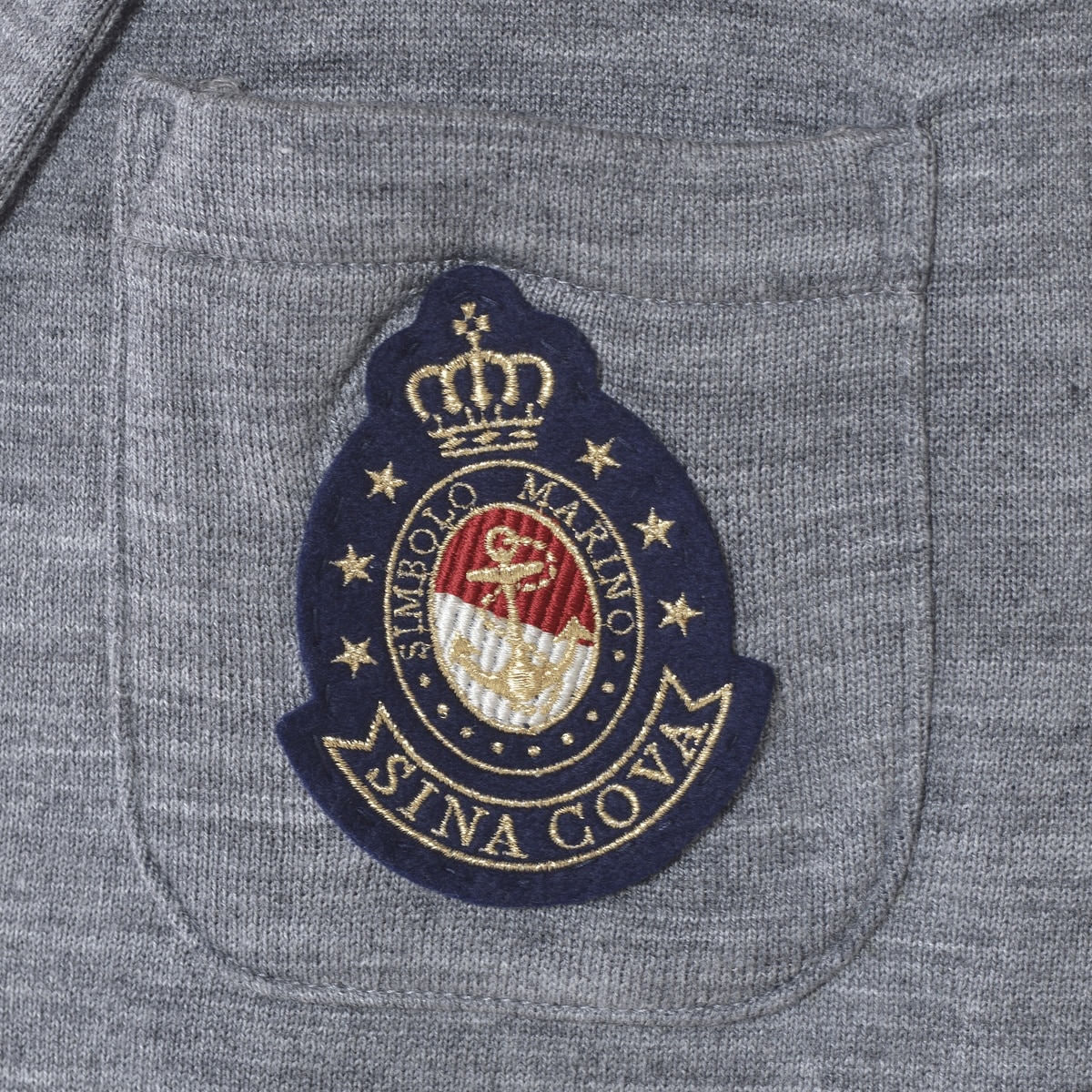 胸ポケットにワッペン、肘にエルボーパッチ、バックにイカリの刺繍し、裏地はボーダー柄にデザインしたニットジャケットです。