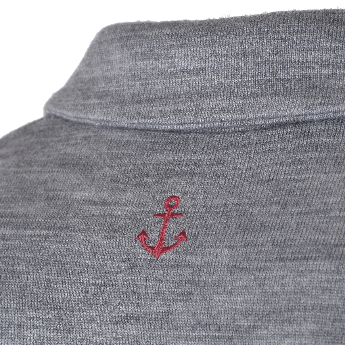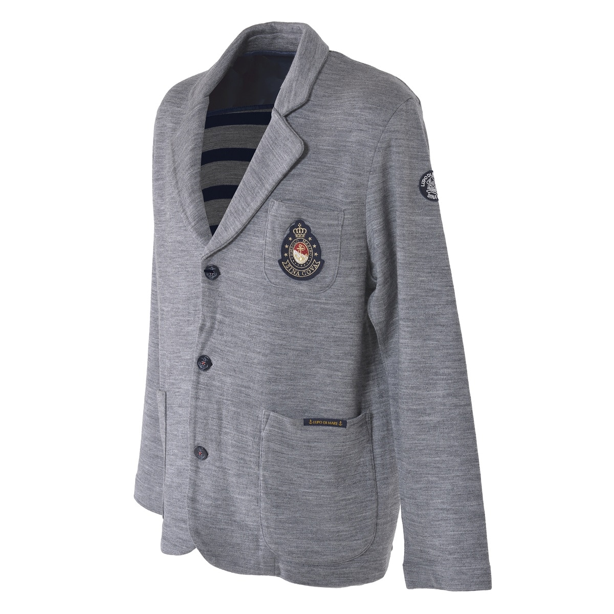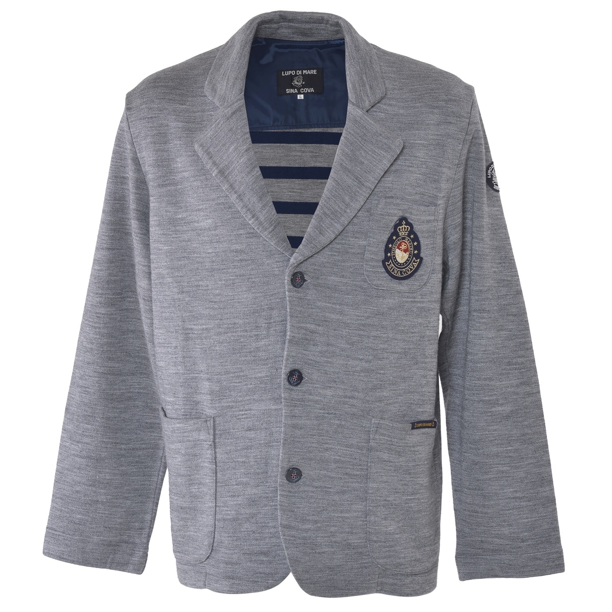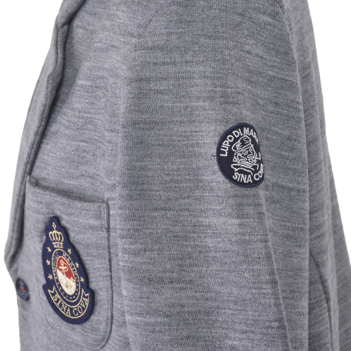 胸ポケットにワッペン、肘にエルボーパッチ、バックにイカリの刺繍し、裏地はボーダー柄にデザインしたニットジャケットです。