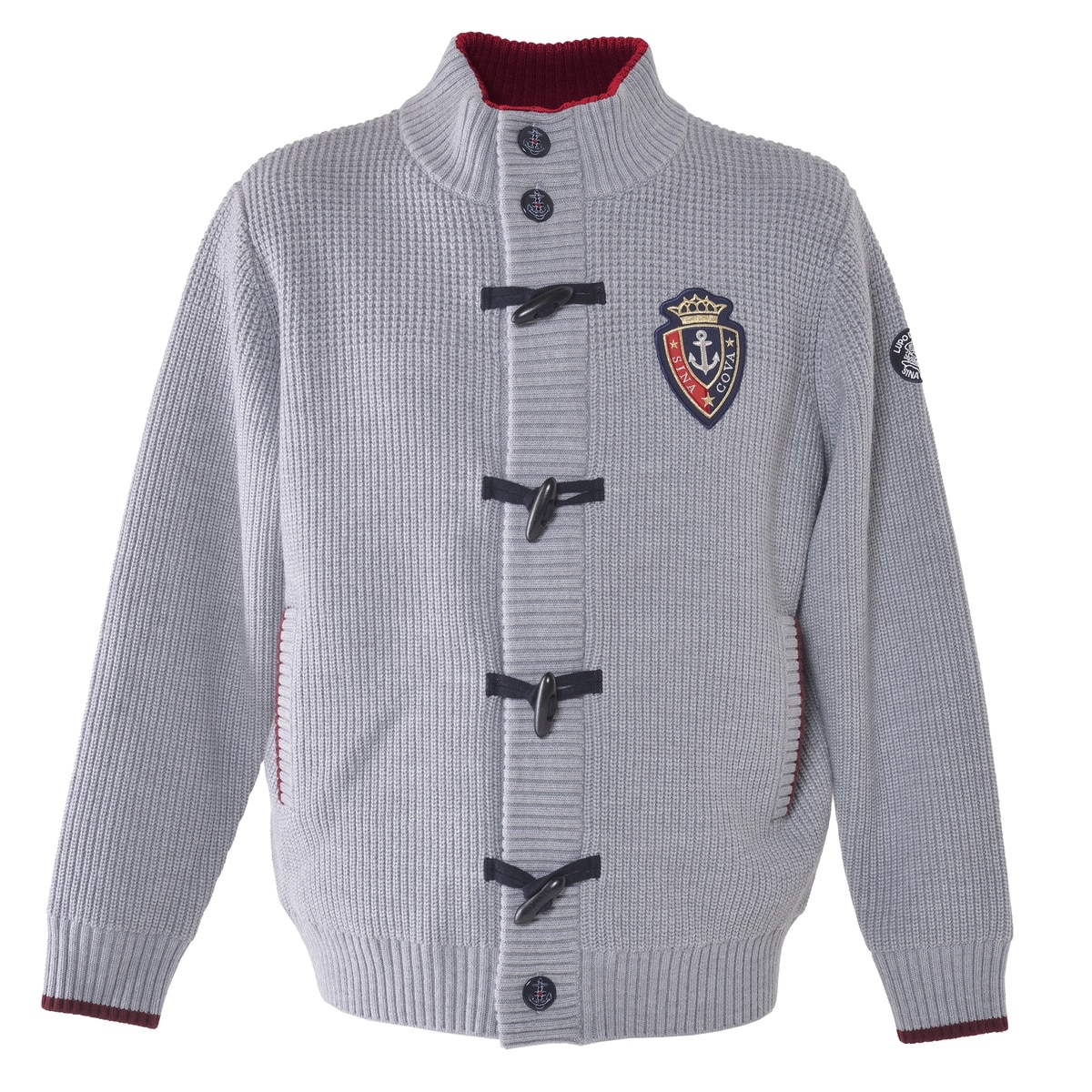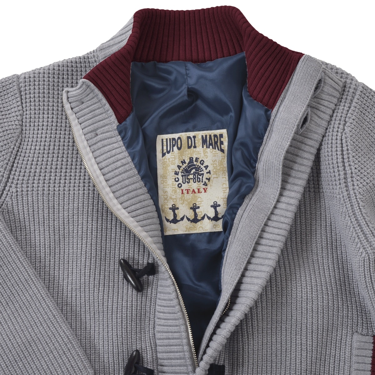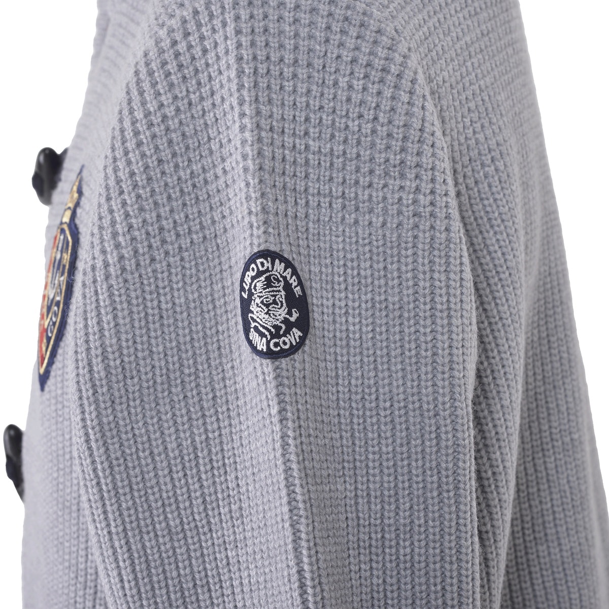 フロントにエンブレムワッペンとトグルボタンをデザインしたニットジャケットです。
