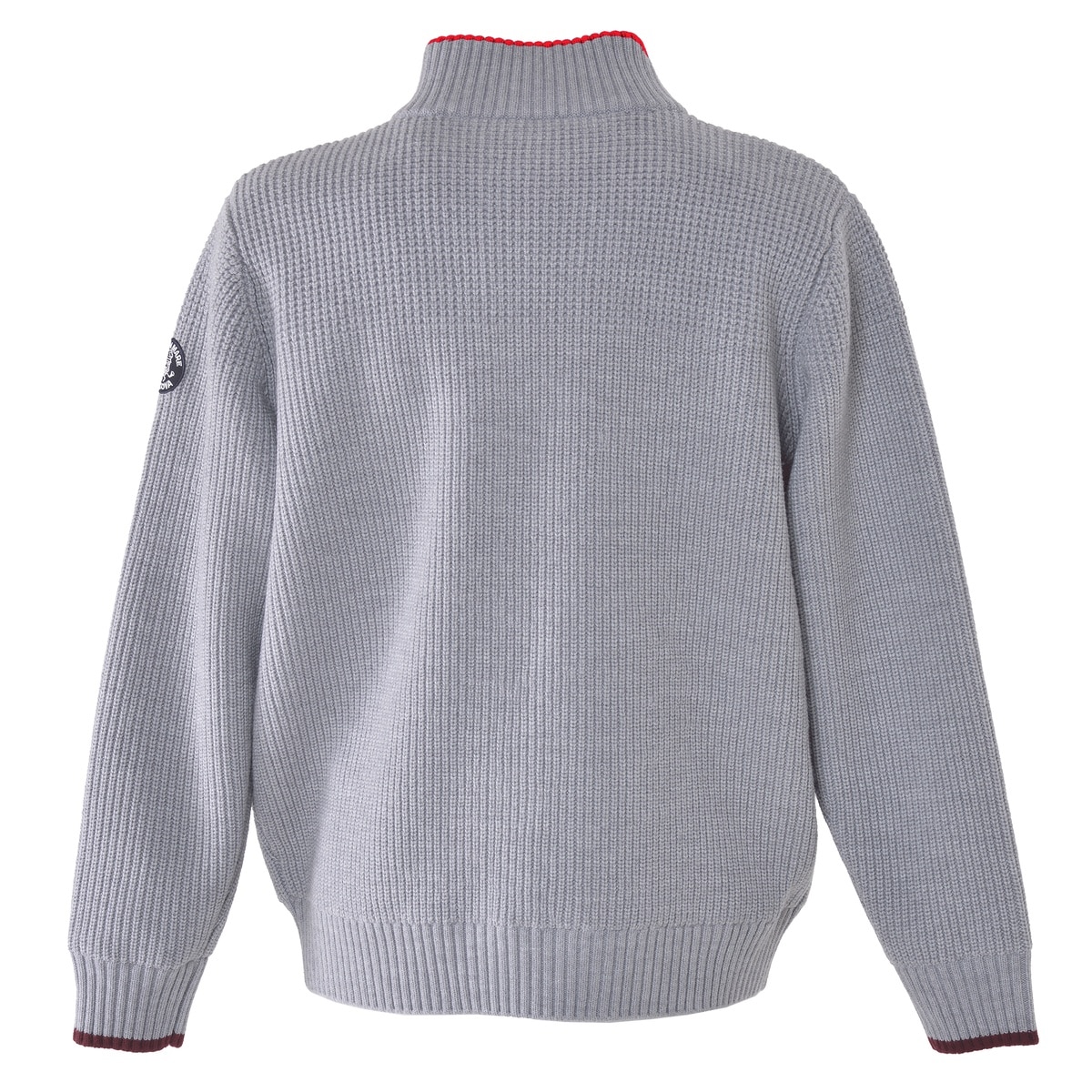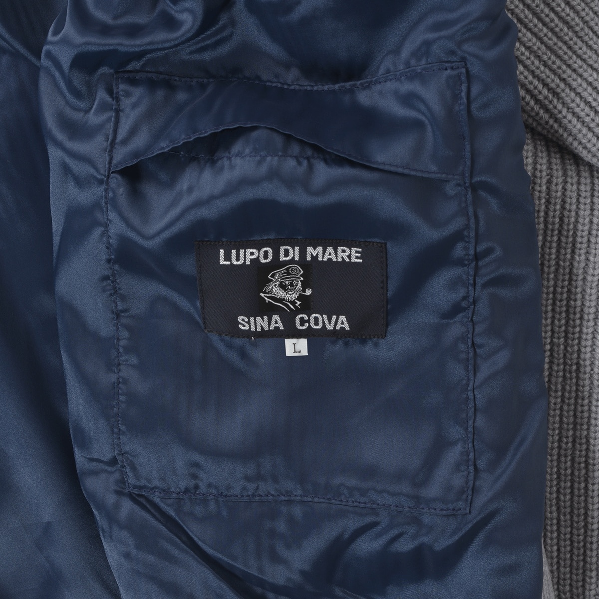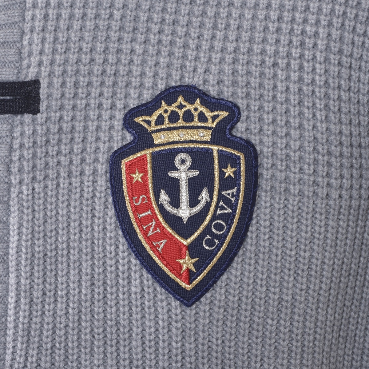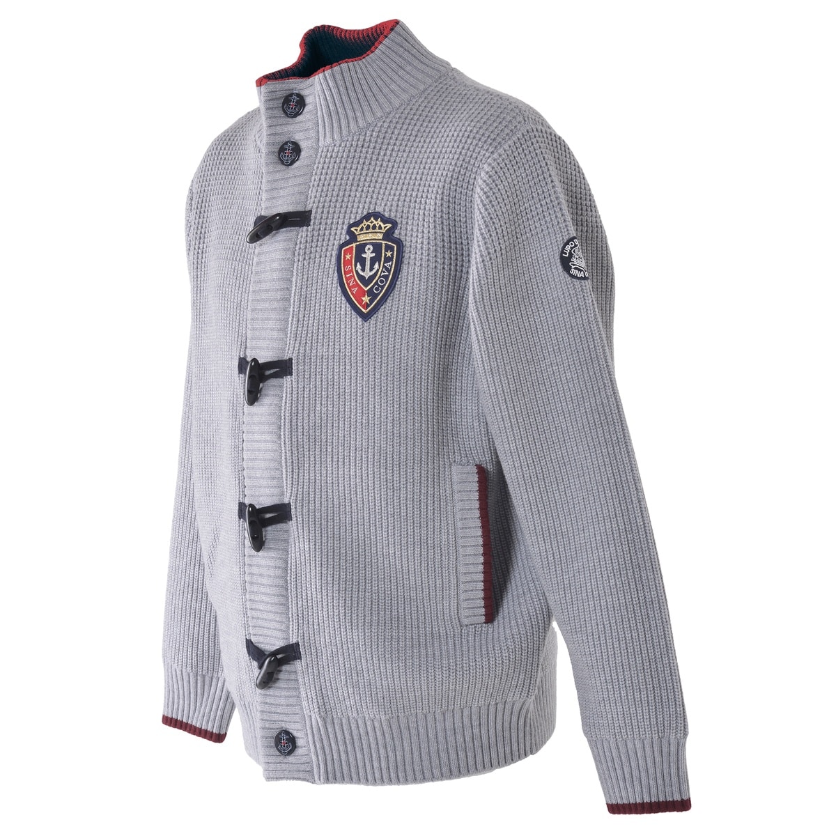 フロントにエンブレムワッペンとトグルボタンをデザインしたニットジャケットです。