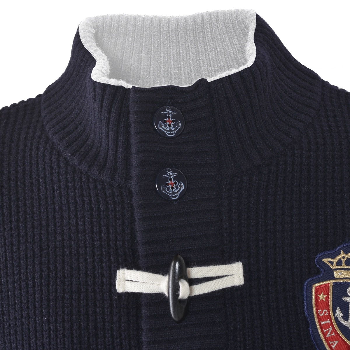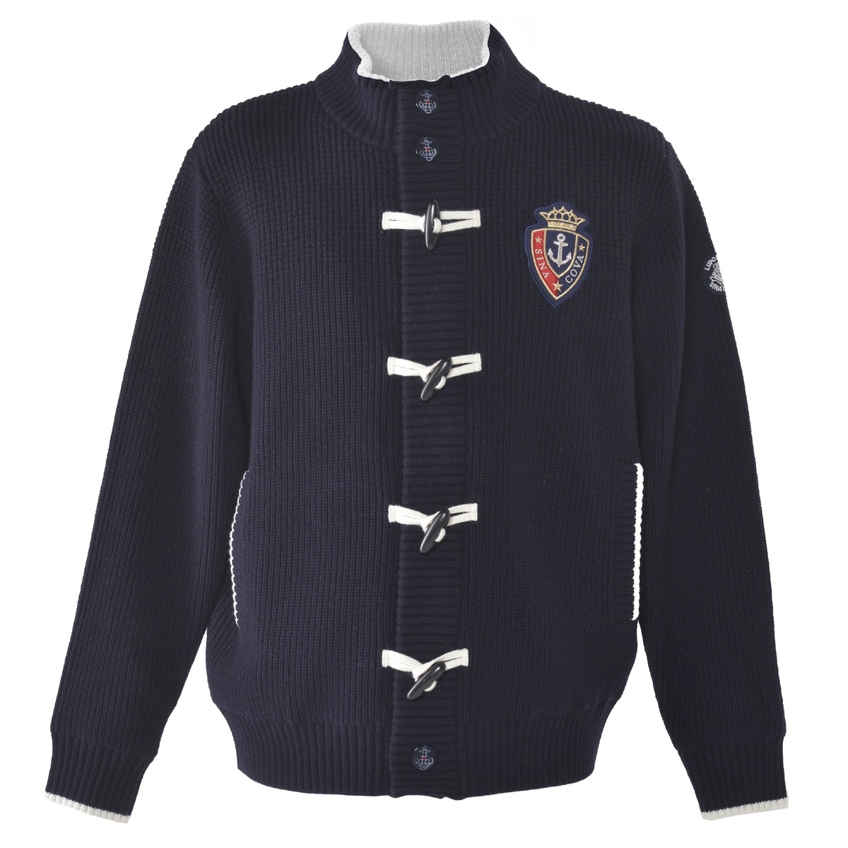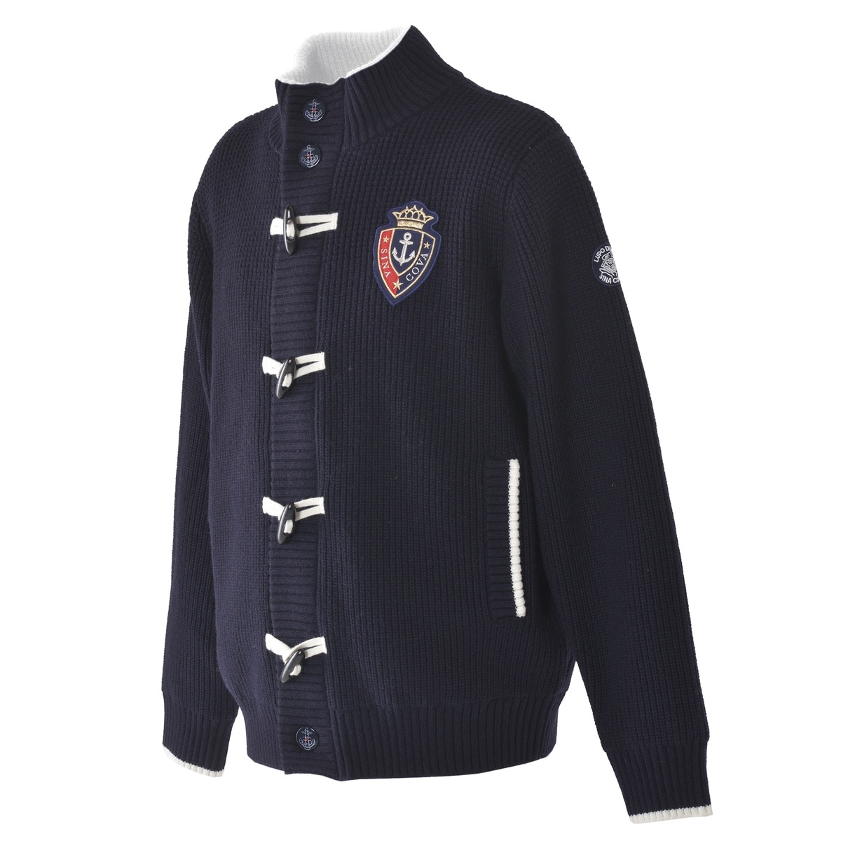 フロントにエンブレムワッペンとトグルボタンをデザインしたニットジャケットです。