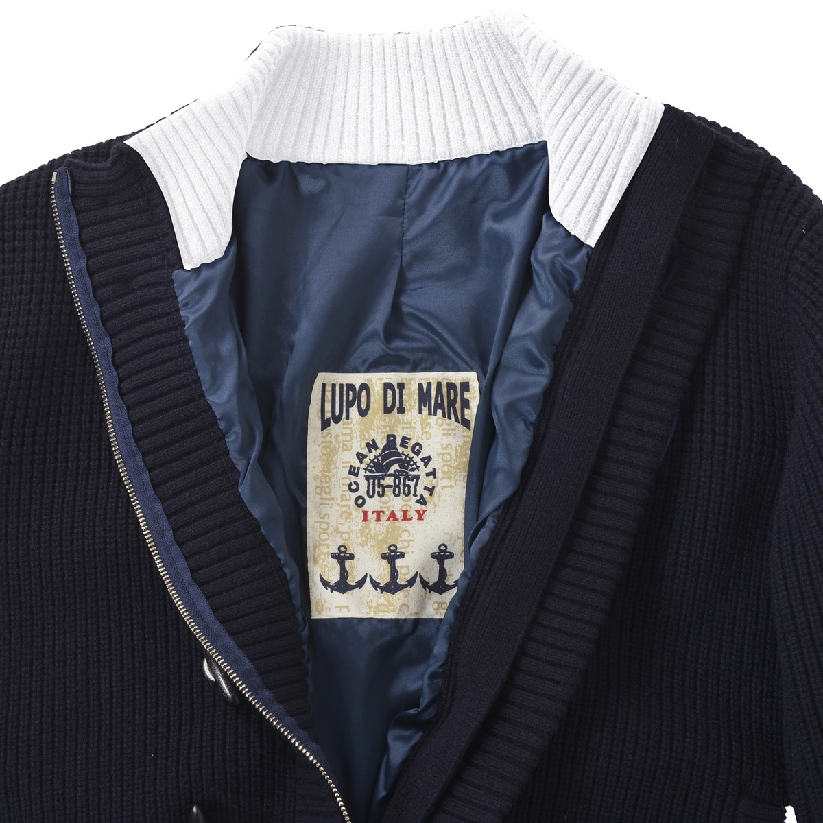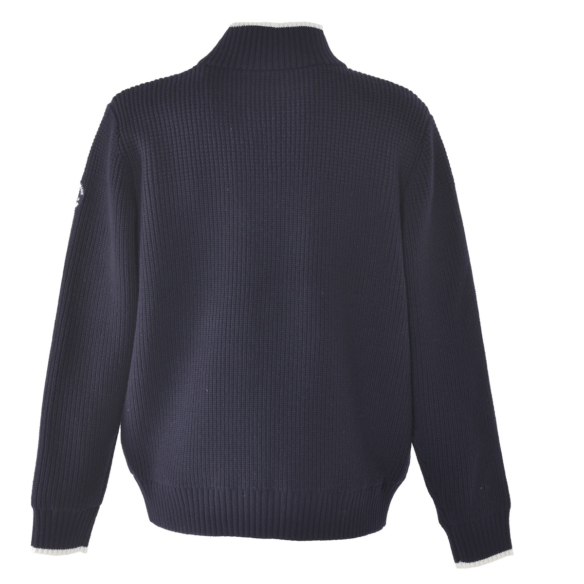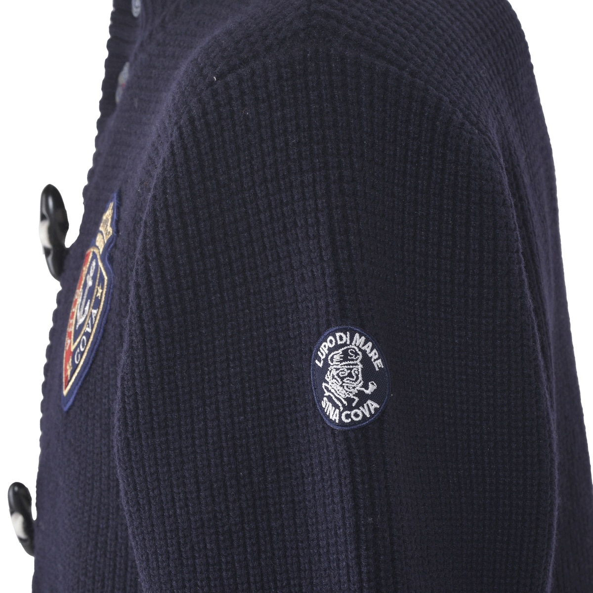 フロントにエンブレムワッペンとトグルボタンをデザインしたニットジャケットです。