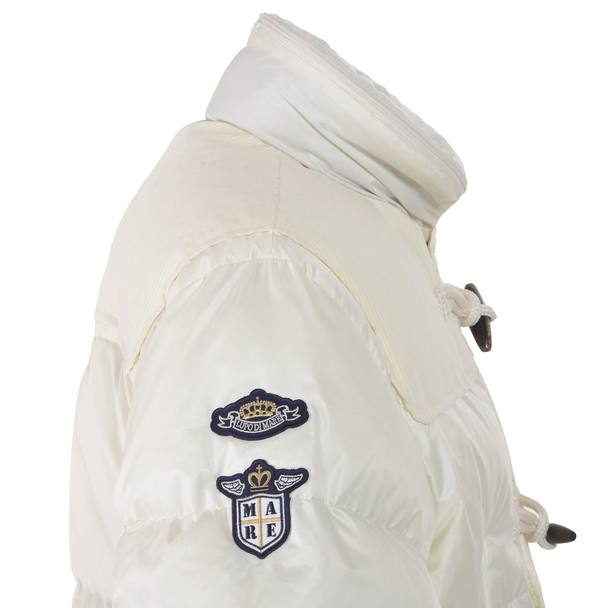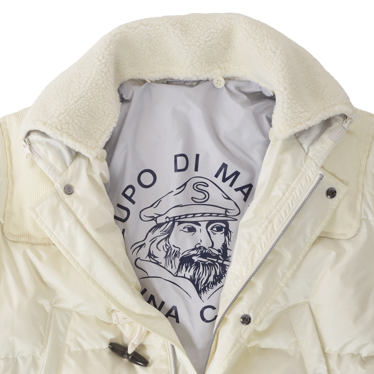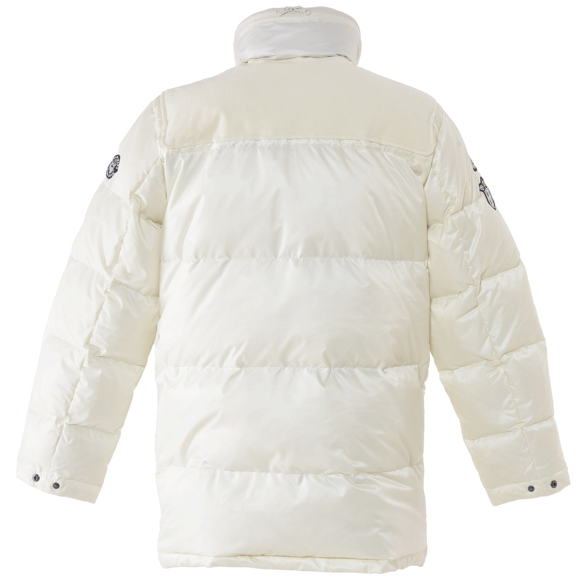 右袖に2種類のワッペン、背裏にはシンボルマークのロゴをプリントしたクルージングハーフダウンコートです。