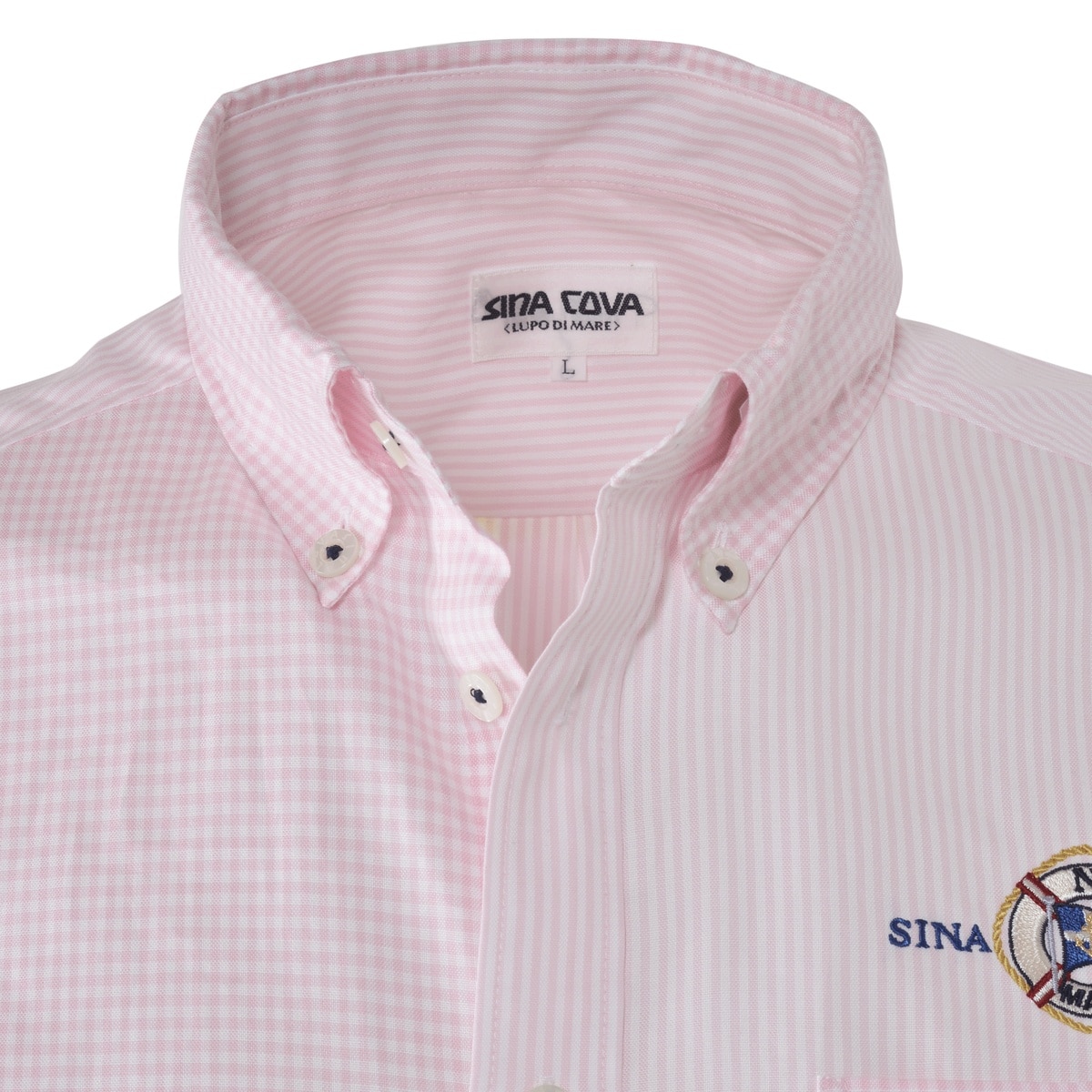ギンガムチェックとストライプ柄を切替で仕上げたボタンダウンシャツ。