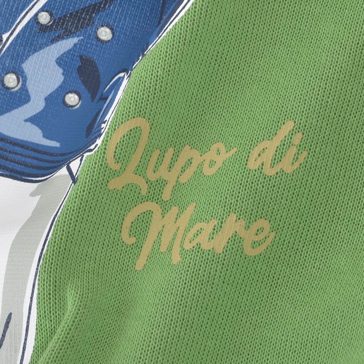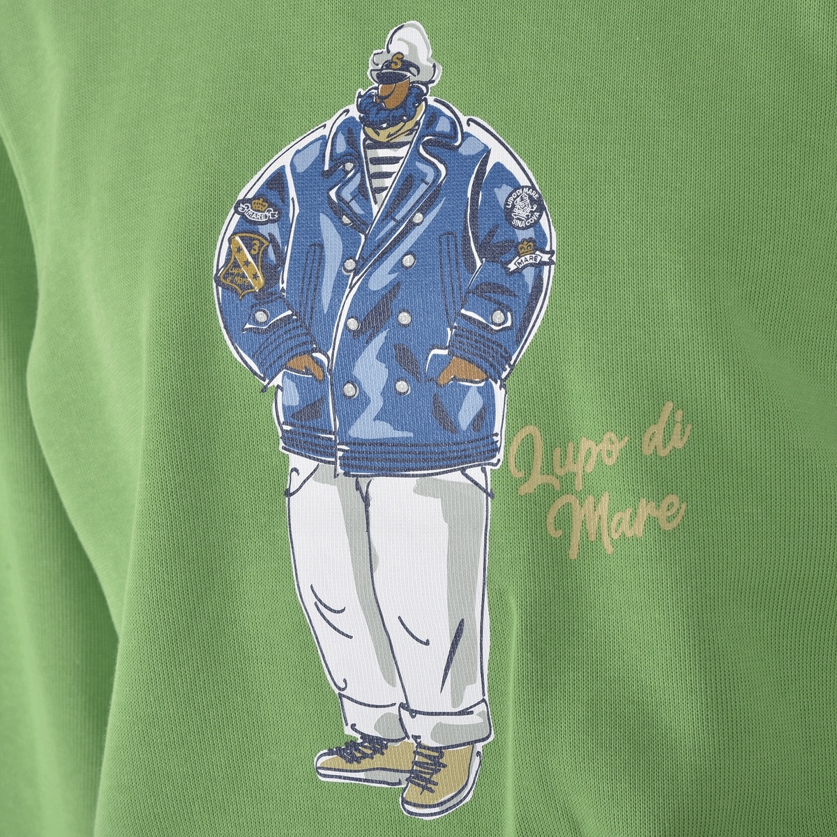 マリンウェアの王道であるPコートを着たキャプテンのイラストプリントをデザインしたクルーネックTシャツです。