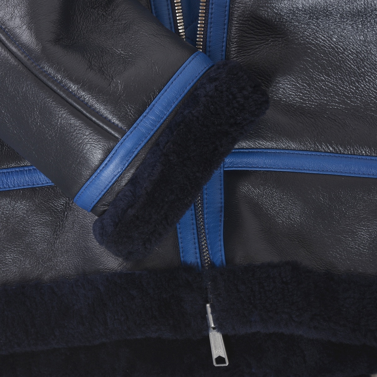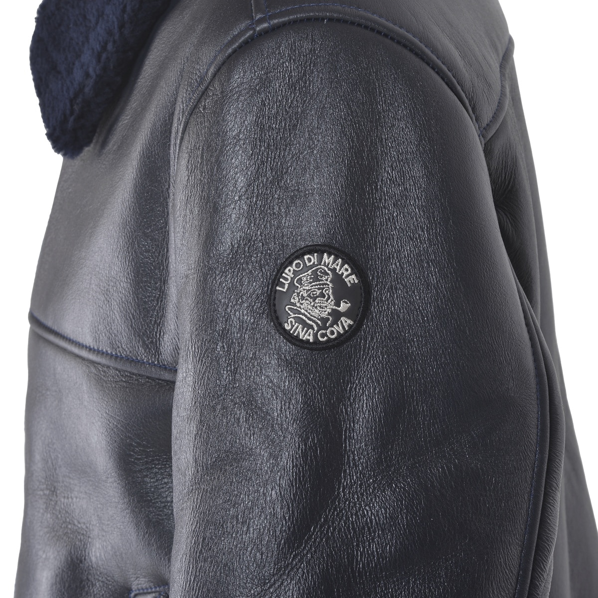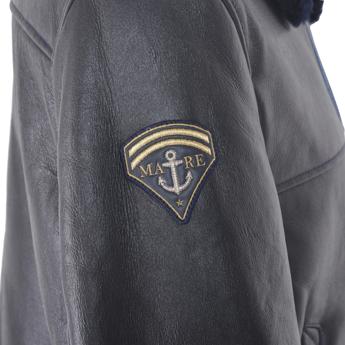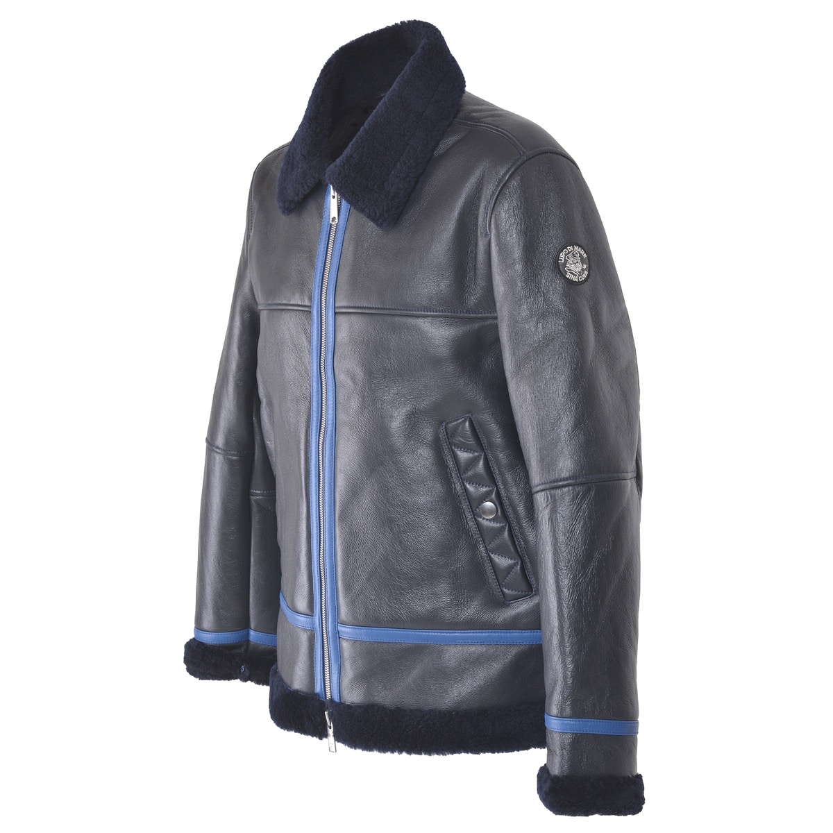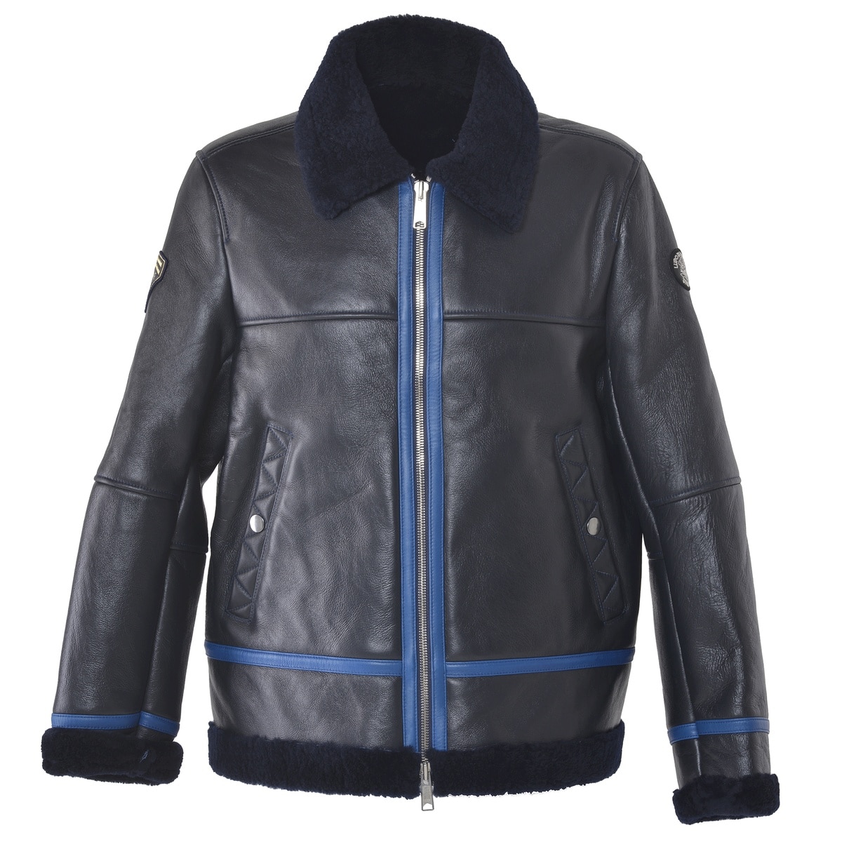 右袖にエンブレムワッペン、ポケットにジグザグステッチをデザインしたムートンレザーフライトジャケットです。